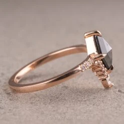 This timeless engagement ring features a .85 carat opaque black lozenge diamond. The diamond is a top quality, natural diamond and has been set in a low profile prong setting with a half-halo of faceted white diamonds with the focal point being a white marquise diamond. The design is completed with three GHSI white round diamonds, set into the band on either side!