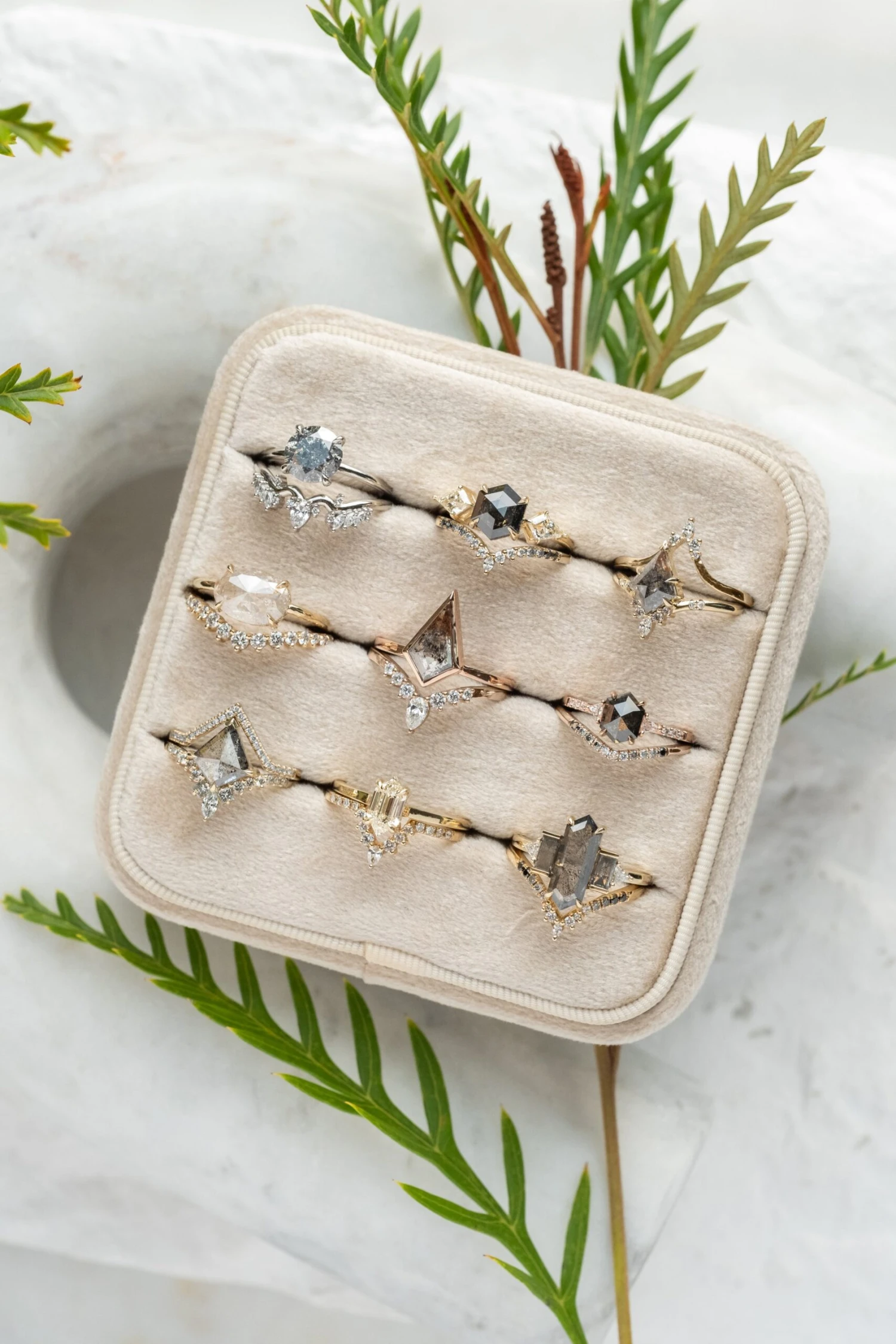Included with your order – A Point No Point Studio digital ring certificate on a branded PNP USB drive, black velvet clam shell box, and a polishing cloth.