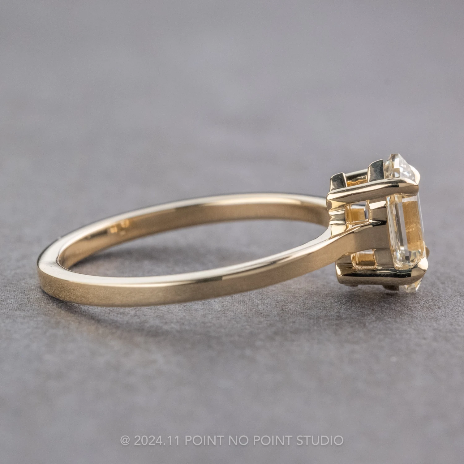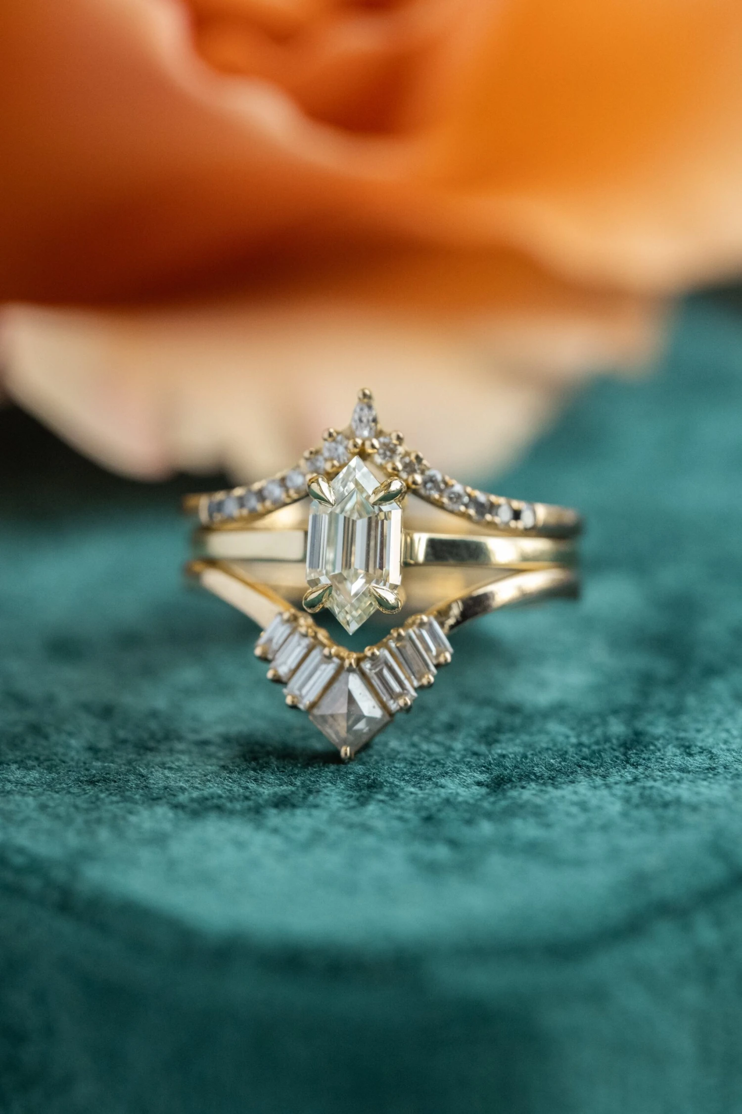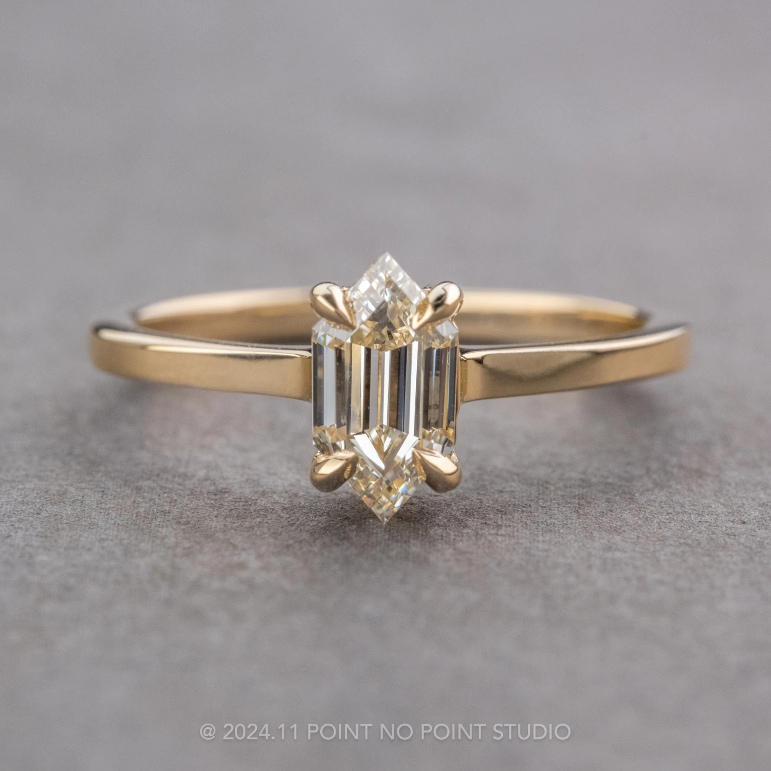 This engagement ring features a STUNNING 1.01 carat clear step cut hexagon shaped diamond. The diamond’s cut ensures maximum brilliance and fire, making it a truly captivating ring. The top quality, all-natural diamond has not been heat treated or enhanced in any way; it has been set into a 4 prong raised setting that is a combination of our basket and cathedral settings allowing it to shine brilliantly from every angle!