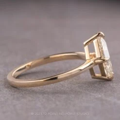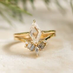 The ring features a gorgeous 1.01 carat clear lozenge shaped diamond. The diamond is a top-quality, all-natural stone that has not been heat treated or enhanced in any way. The ring is a combination of our basket and cathedral settings.Â