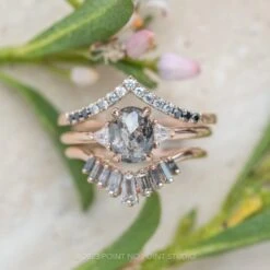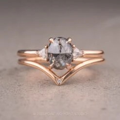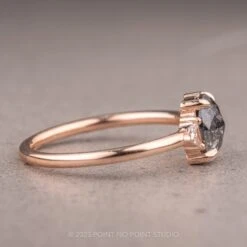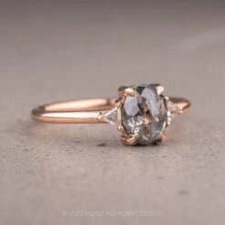 This stunning salt and pepper ring features a gorgeous oval rose cut diamond. The diamond is a top quality, un-enhanced, semi translucent natural black and grey speckled diamond; set on either side of the center stone are white GHSI triangle diamonds.  The diamond is set into an open back setting which allows you to see and admire the unique inner structure, tones, and marbling of the diamond.