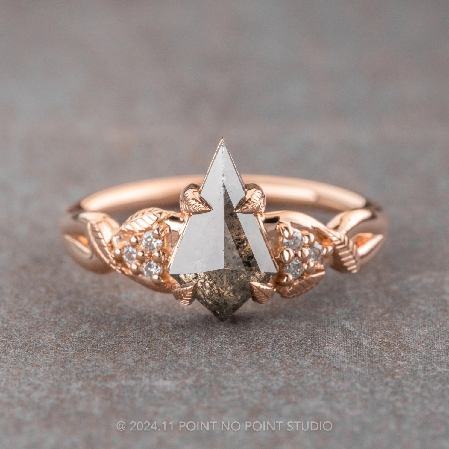 This unique, nature inspired engagement ring features a 1 carat black speckled rose cut kite shaped diamond. The diamond is a top-quality, natural stone that has not been heated or treated in any way; it is semi-translucent with unique tones and facets that catch the light. The woven setting is completed with a leaf pattern that has been hand engraved with a cluster of GHSI faceted white diamonds on either side of the center kite.