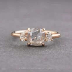 This ring features a beautiful .87 carat semi-translucent icy white rose cut cushion diamond. The diamond is a top quality, natural un-enhanced stone; set vertically on either side of the center stone are sparkly VS white oval diamonds. The diamond is set into an open back setting which allows you to see and admire the unique inner structure, tones, and marbling of the diamond.