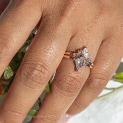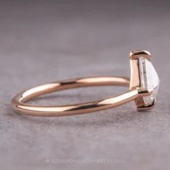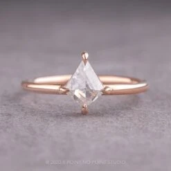 The kite diamond is set into a prong setting that sits directly on the finger. The ring band is 1.7mm round and extremely comfortable to wear. This entire ring setting is made from recycled 14k rose gold.