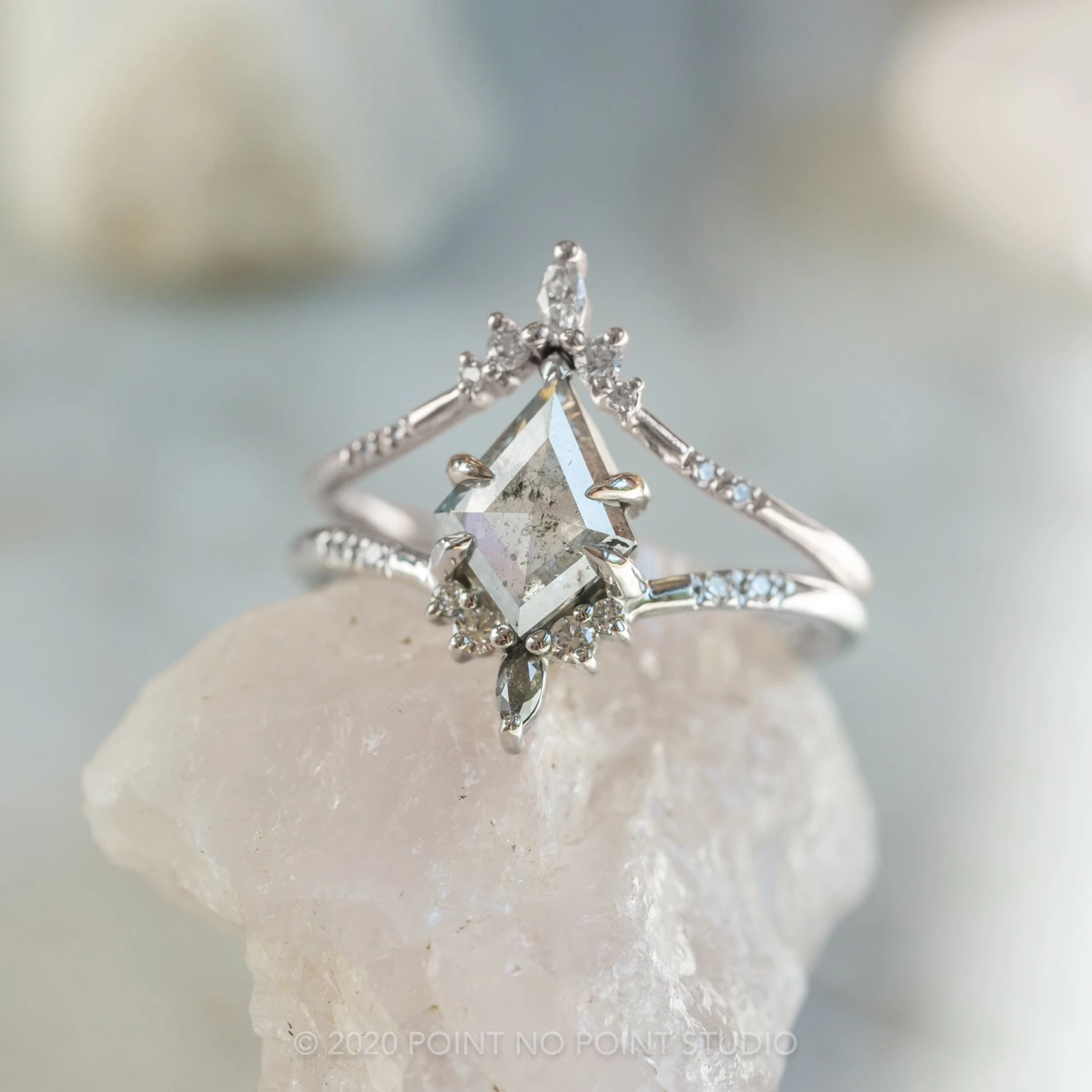 This timeless engagement ring features a striking Canadian salt and pepper kite double cut diamond with a super unique inner marbling. The diamond is a top quality natural diamond and has been set in a low profile prong setting surrounded by faceted white diamonds with the focal point being a salt and pepper marquise diamond. The entire ring is made of Platinum.