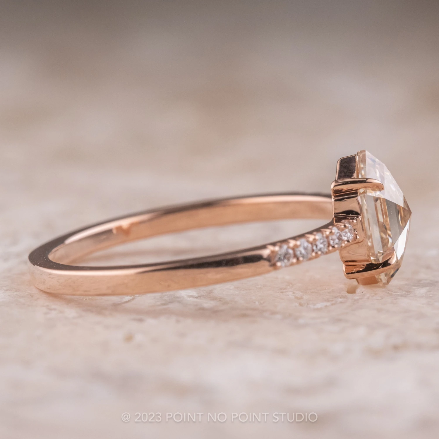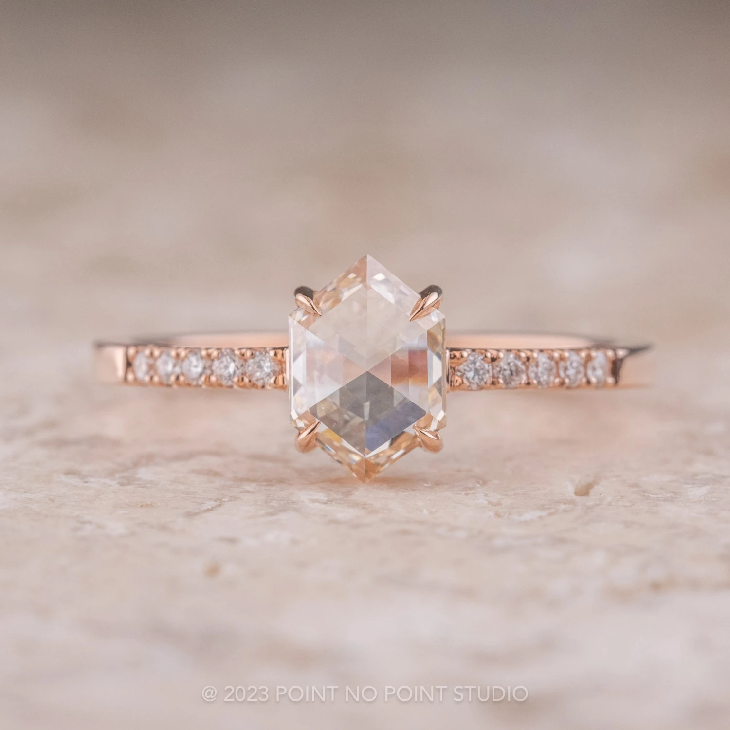 This engagement ring features a mesmerizing and incredibly sparkly 1.04 carat all-natural champagne colored diamond. The rose cut, hexagon shaped diamond is a top quality stone that has not been heated or treated in any way; it is completely translucent with unique tones and facets that catch the light beautifully! Set into the band on either side are 5 sparkly GHSI white brilliant cut diamonds to complete the look.Â