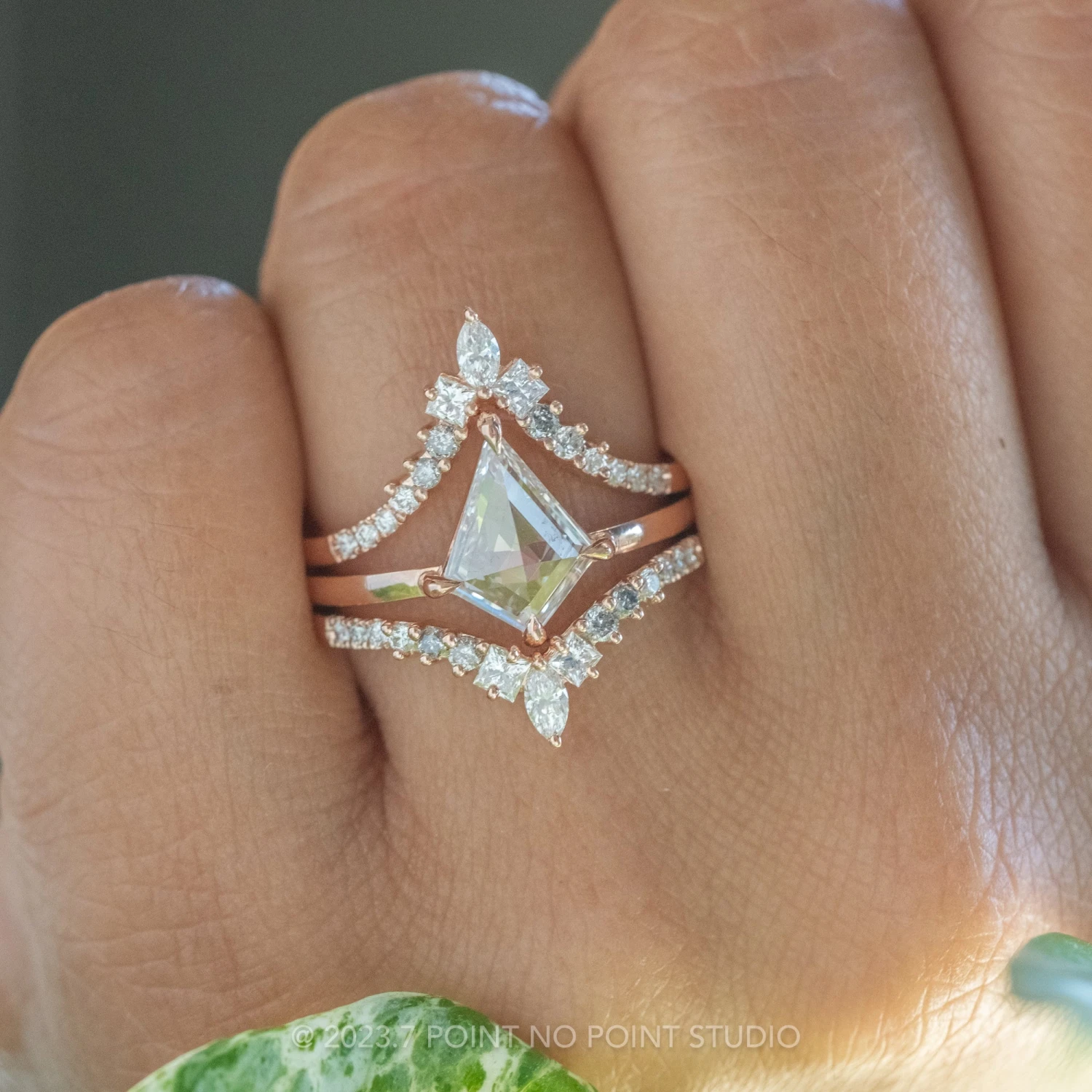 The ring features a gorgeous 1.15 carat translucent kite shaped diamond. The diamond is a top-quality, all-natural stone that has not been heat treated or enhanced in any way.