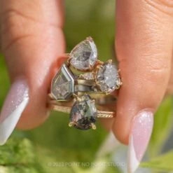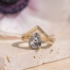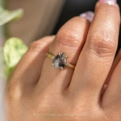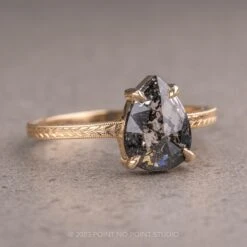 This ring features a stunning 1.15 carat semi-translucent salt and pepper pear diamond. The diamond is a top quality natural diamond, and has been set in a low profile prong setting. The diamond is set into an open back setting which allows you to see and admire the unique inner structure, tones, and marbling of the diamond.Â