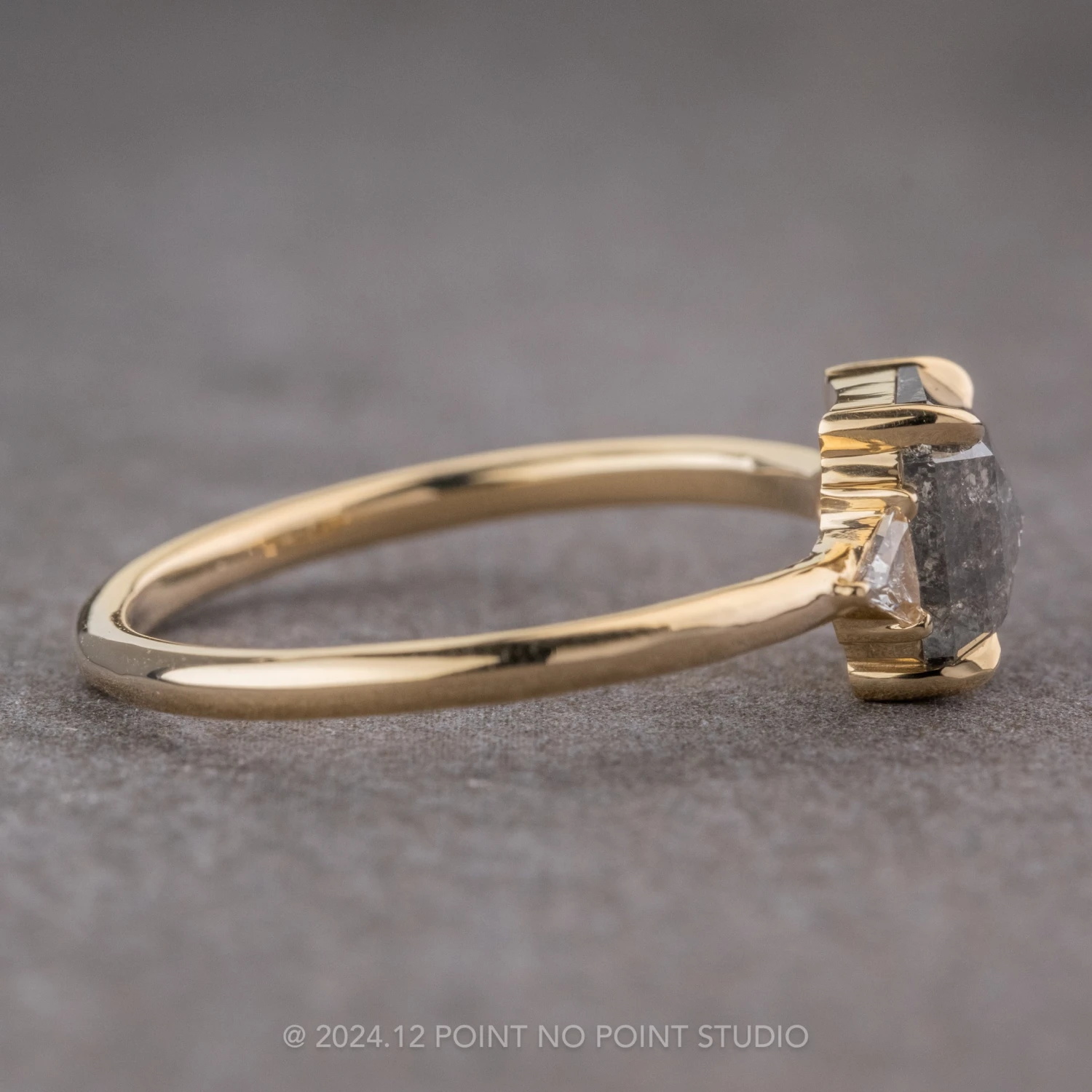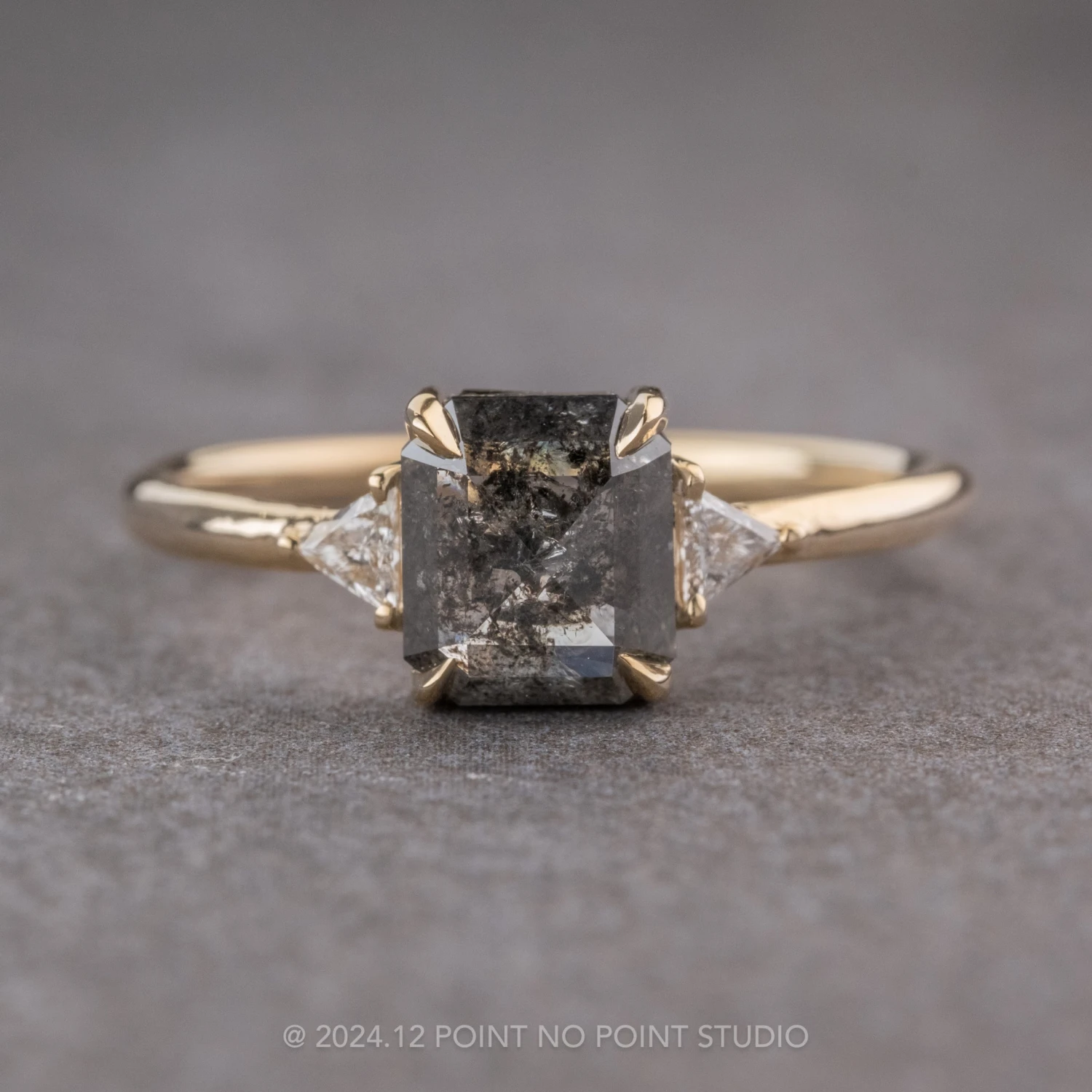 This beautiful ring features a gorgeous 1.02 carat black speckled asscher center diamond. The diamond is a high quality natural diamond that has not been heated or treated in any way; it is semi-translucent with unique tones and facets that catch the light beautifully. Flanked on either side of the diamond are sparkly GHSI white triangle accent diamonds that taper into the band seamlessly.