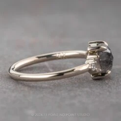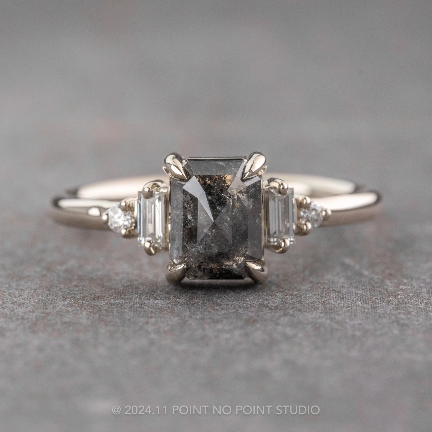 This ring features a beautiful black speckled emerald shaped diamond. The diamond is a top quality, un-enhanced natural diamond; it is semi-translucent with unique tones and facets that catch the light beautifully. Set on either side of the center stone are sparkly GHSI white baguette diamonds followed by GHSI faceted white round diamonds to complete the look. Â