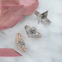 This ring features a beautiful natural salt and pepper diamond, set in a vintage inspired halo setting. The halo features a unique combination of marquise shaped diamonds and round diamonds.