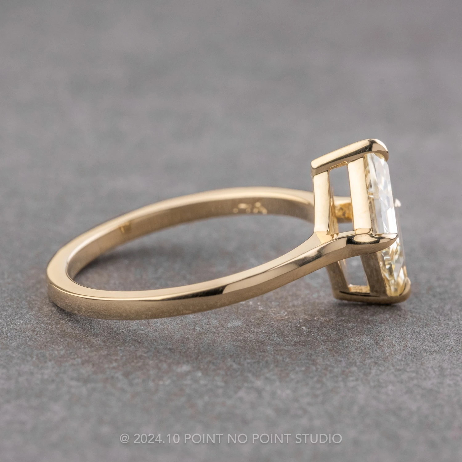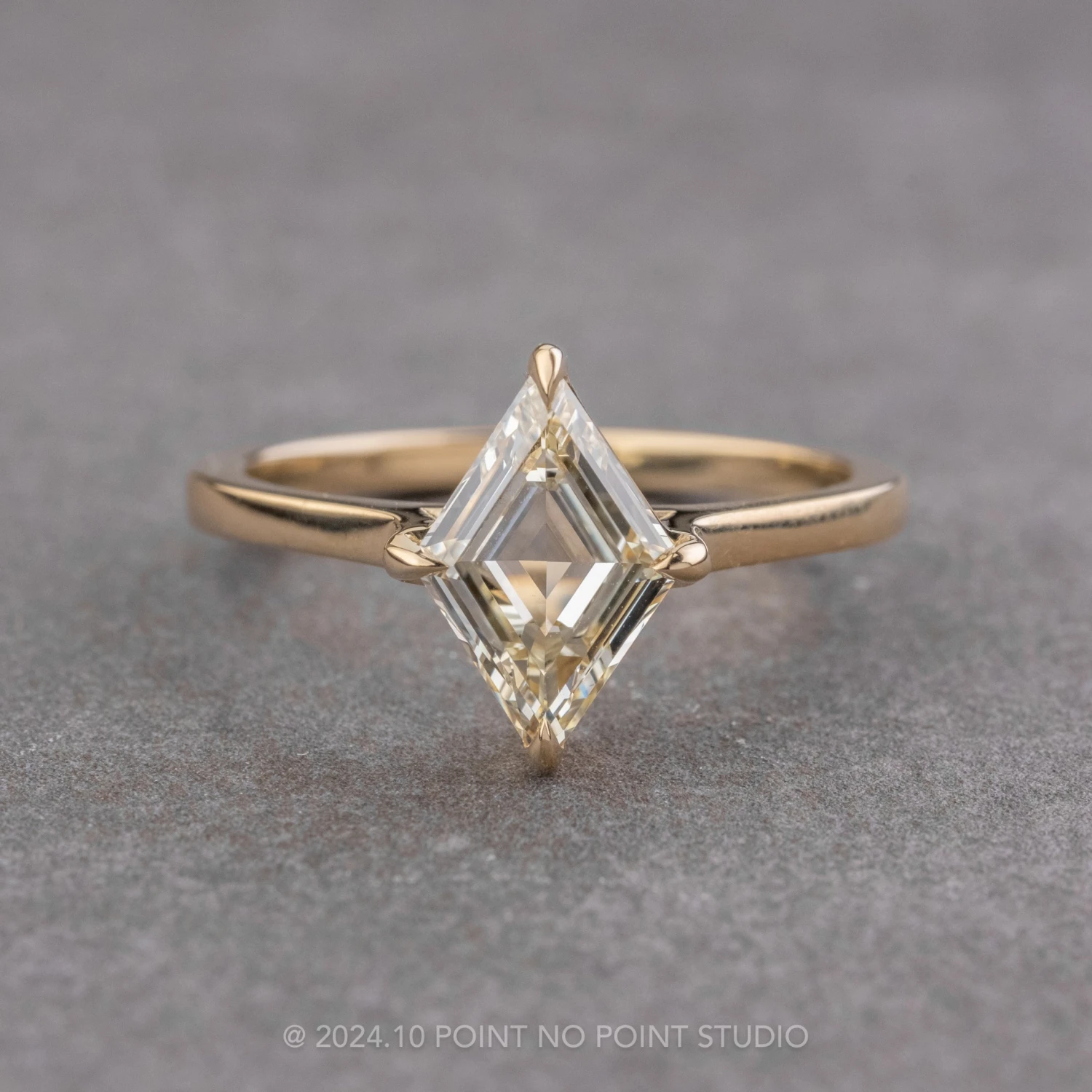 This engagement ring features a STUNNING 1.21 carat clear internally flawless lozenge shaped diamond. The diamond’s clarity ensures maximum brilliance and fire, making it a truly captivating ring. The top quality, all-natural diamond has not been heat treated or enhanced in any way; it has been set into a 4 prong raised setting that is a combination of our basket and cathedral settings allowing it to shine brilliantly from every angle!