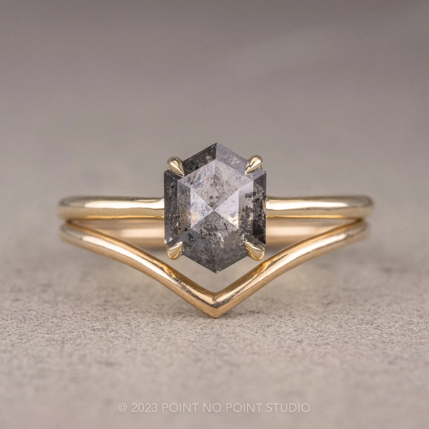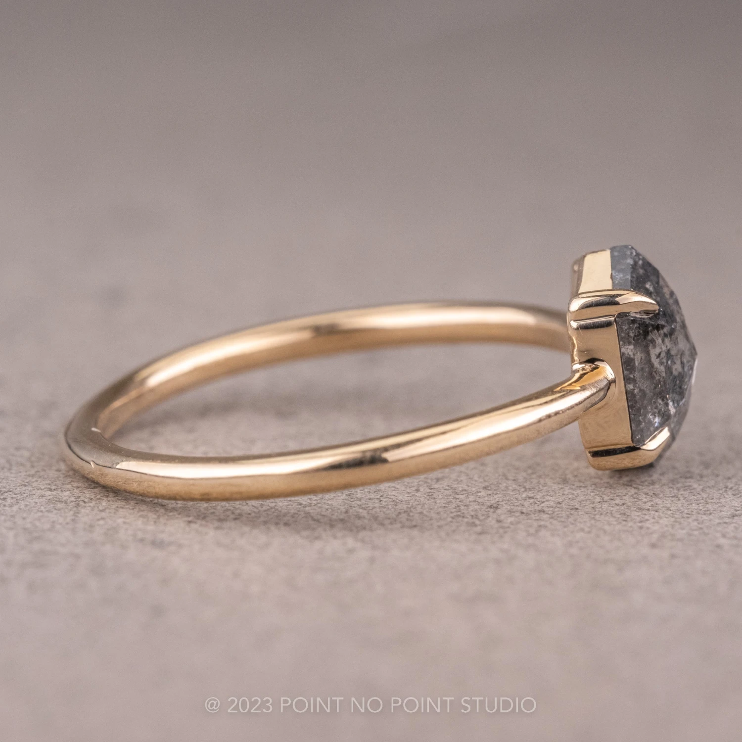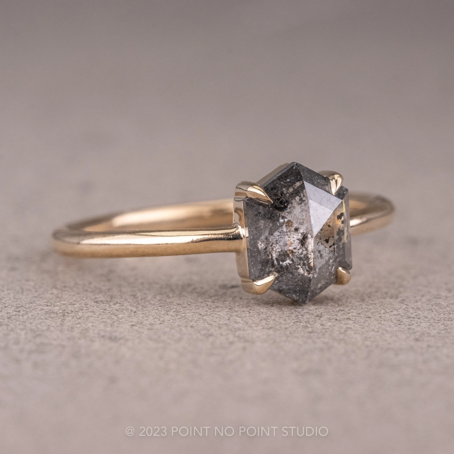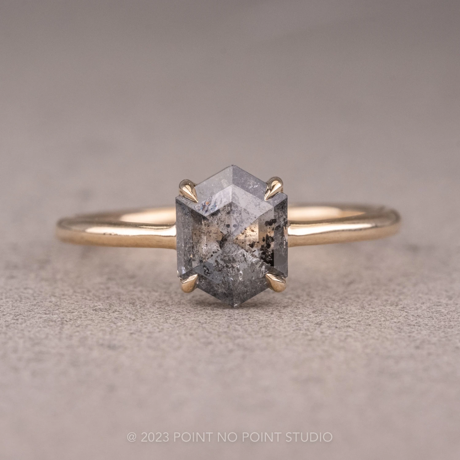 The ring features a beautiful 1.21 carat salt and pepper rose cut hexagon shaped diamond. The diamond is a top-quality, all-natural stone that has not been heat treated or enhanced in any way and is semi-translucent with speckled tones of black.Â
