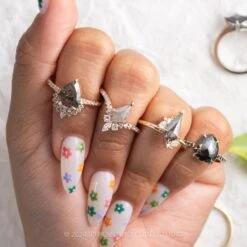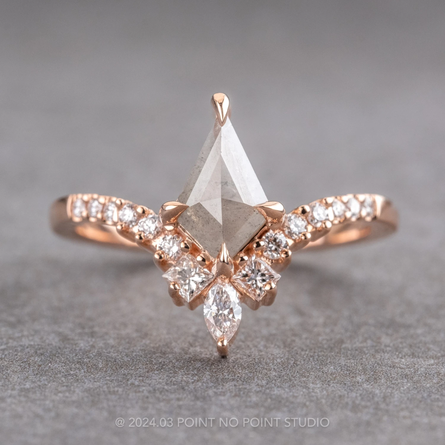 This timeless and unique engagement ring features a striking .89 carat icy grey rose cut kite diamond. The diamond is a top quality un-enhanced diamond; it is semi-translucent with unique tones and facets that catch the light. Sitting under the kite diamond is a gently sloping half-halo of white diamonds in various shapes with a marquise diamond as the focal point.Â