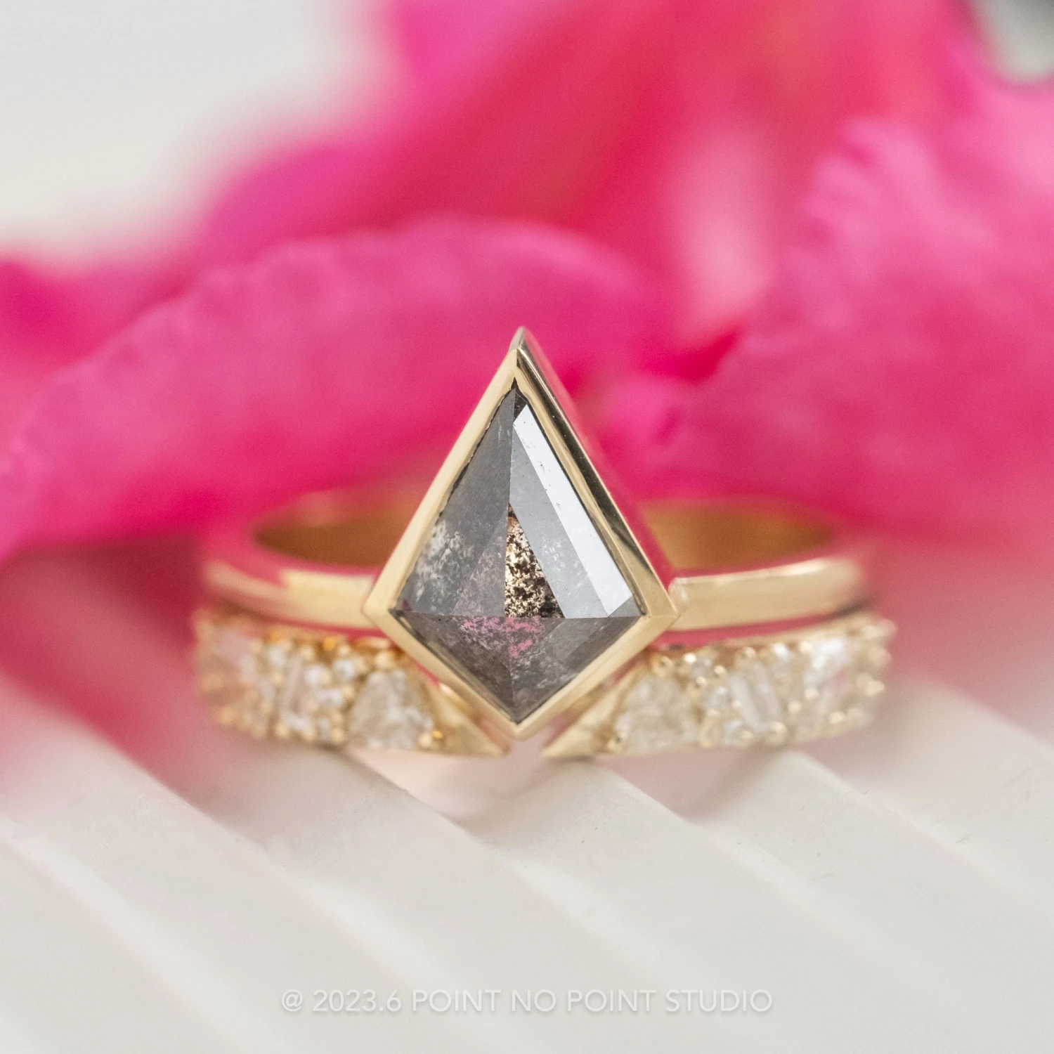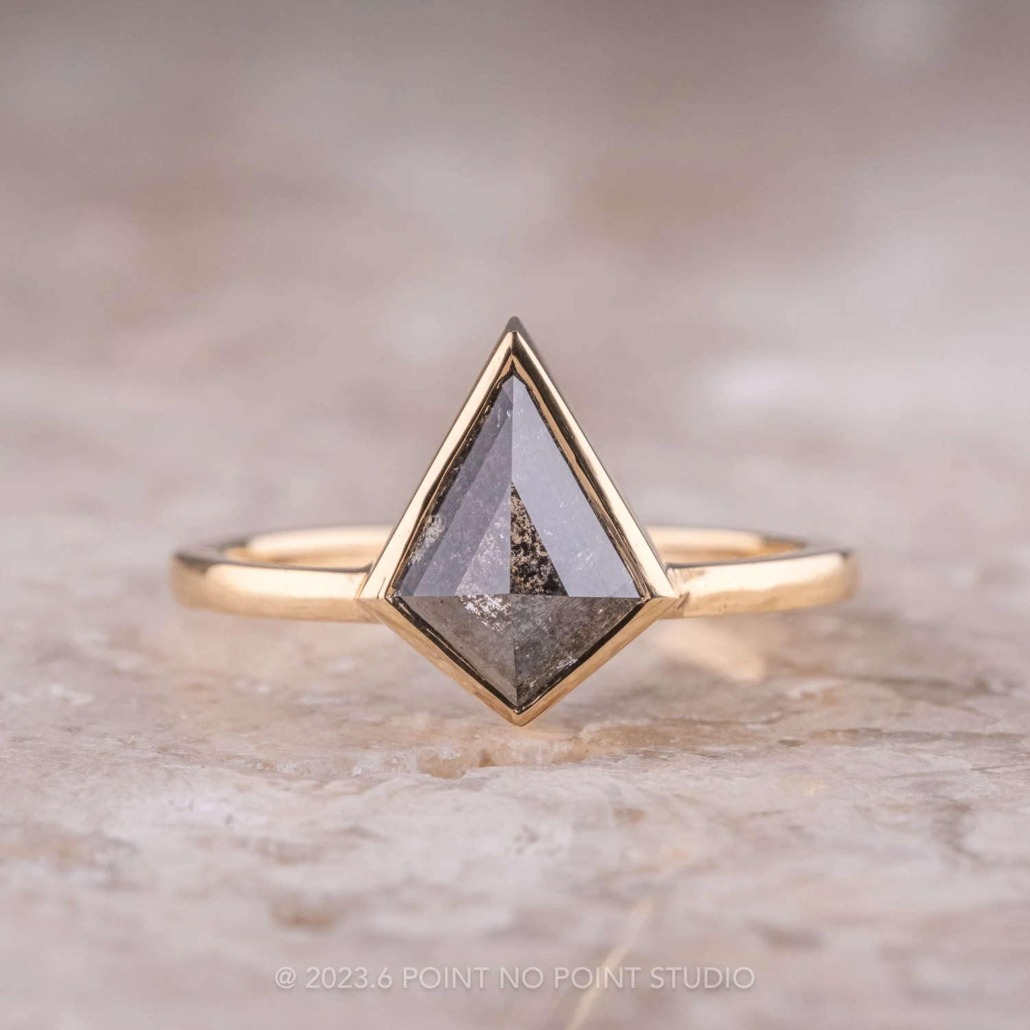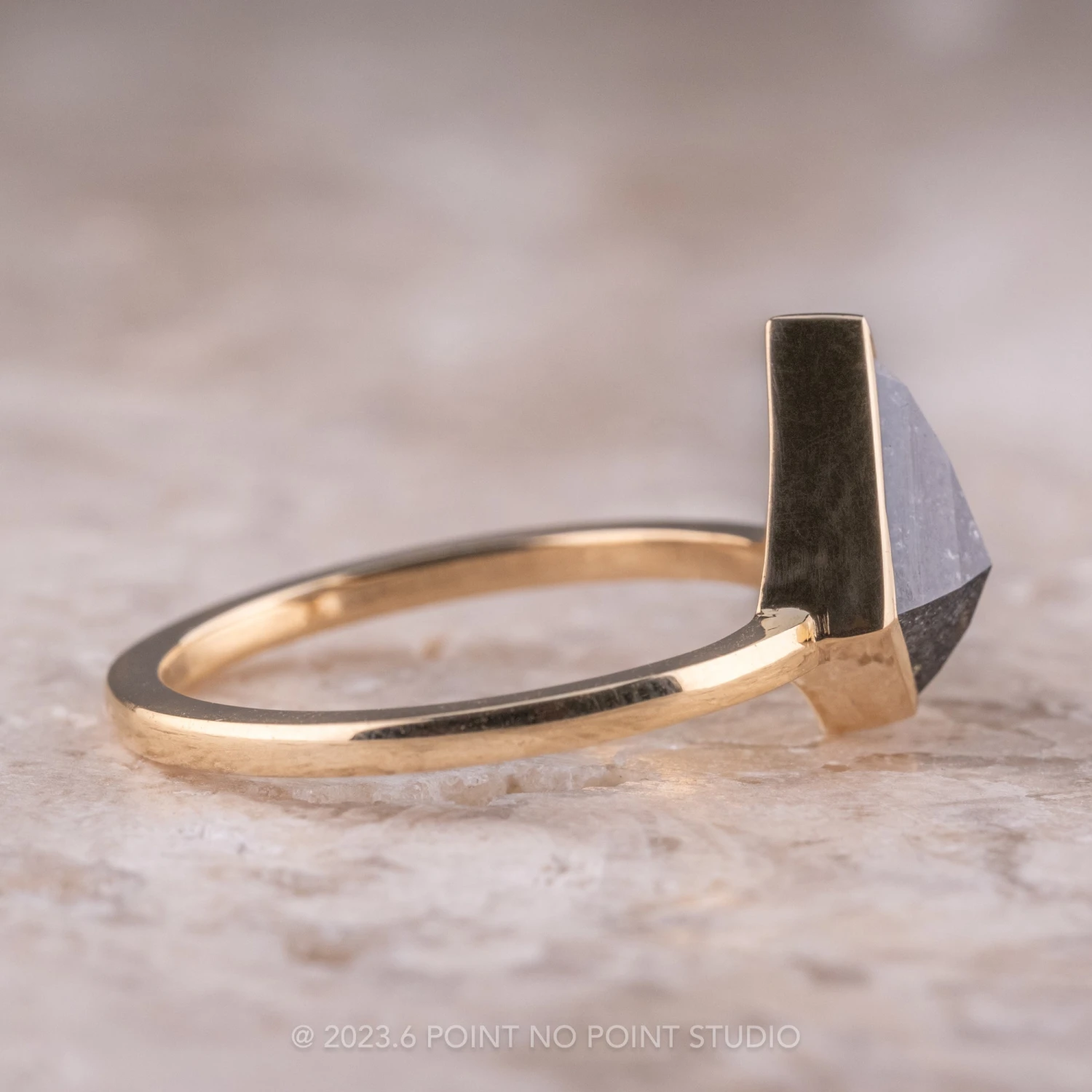 The ring features a beautiful 1.25 carat black speckled rose cut kite shaped diamond. The diamond is a top-quality natural diamond that has not been heat treated or enhanced in any way. The kite diamond is set into an encompassing bezel setting that sits directly on the finger. The ring band is a ‘loaf’ profile and is extremely comfortable to wear. This entire ring setting is made from eco-friendly recycled 14k yellow gold.