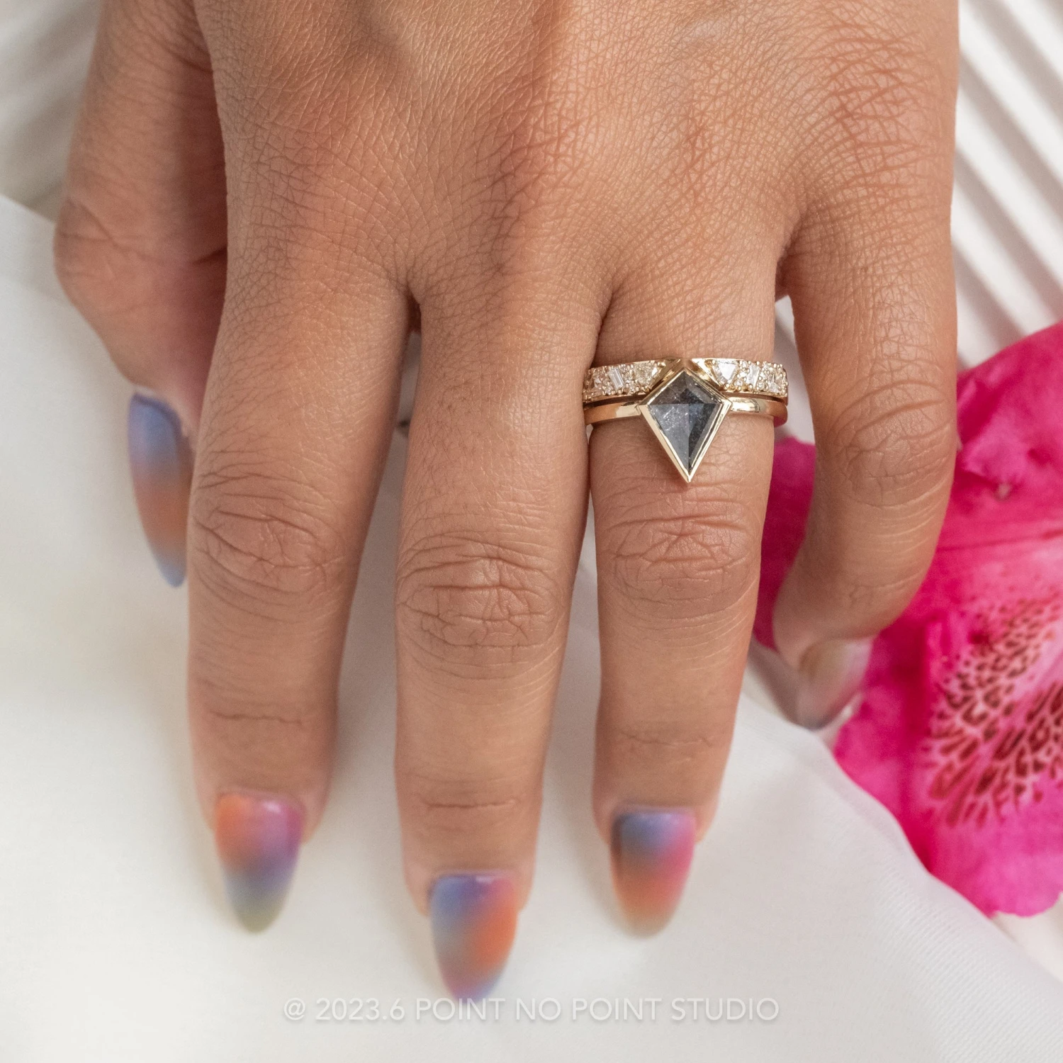 Included with your order – A Point No Point Studio digital ring certificate on a branded PNP USB drive, black velvet clam shell box, and a polishing cloth.