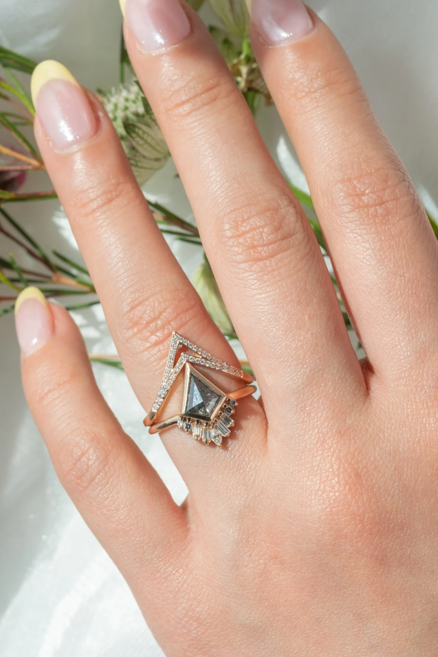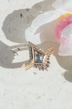 The rose cut diamond has been set in a low-profile bezel setting. The bezel fully encompasses the kite diamond. The entire ring is made of eco-friendly recycled 14k peach gold and sits directly on the finger making this ring extremely comfortable to wear.