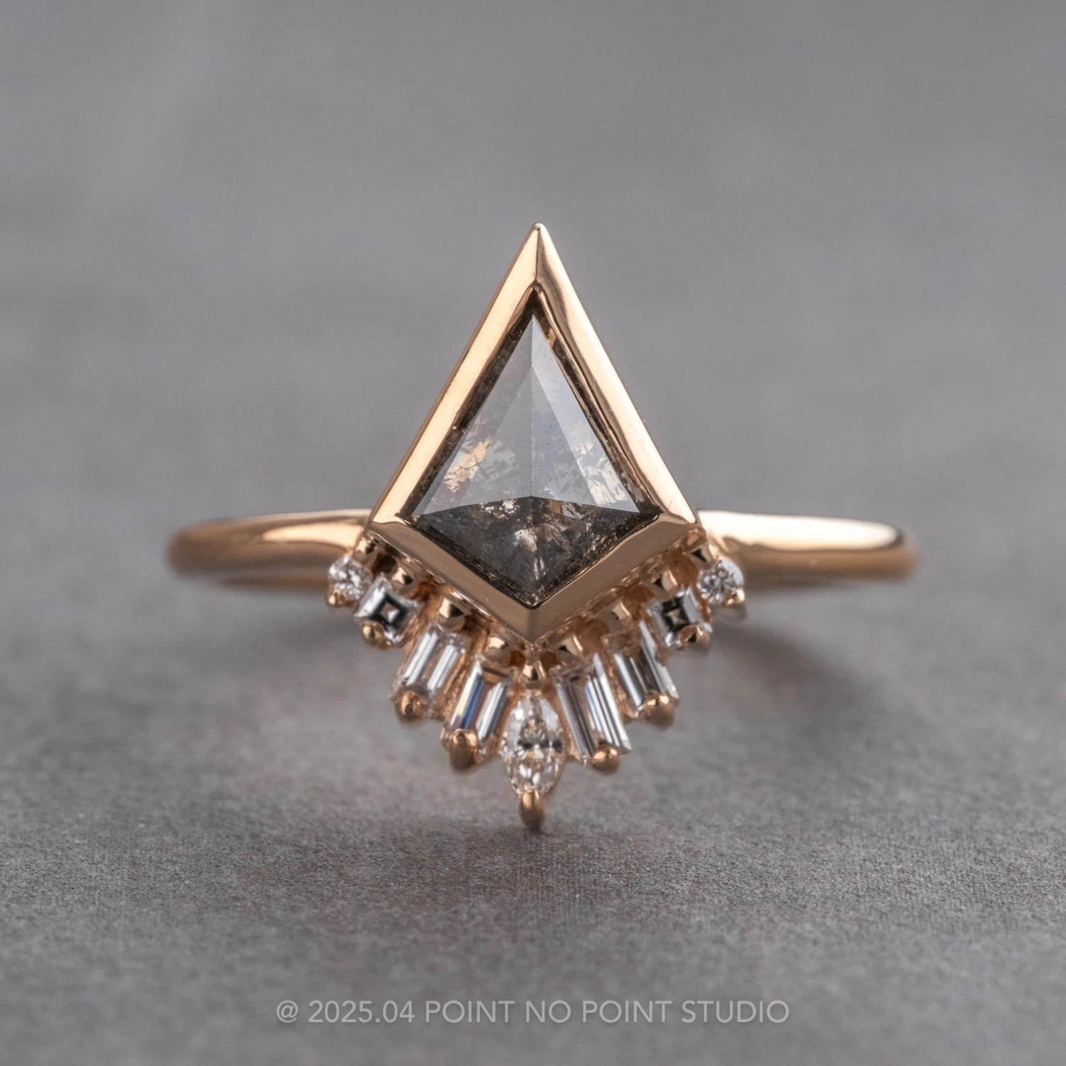 This engagement ring features a striking 1.09 carat salt and pepper rose cut kite shaped diamond. The diamond is a top quality un-enhanced diamond; it is semi-translucent with unique tones and facets that catch the light. The diamond sits on top of a sparkly half-halo of faceted white diamonds in various shapes with the focal point being a white marquise diamond.