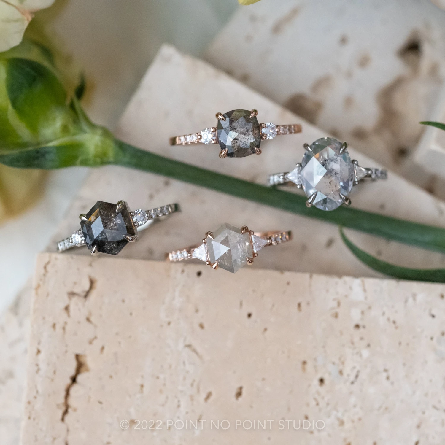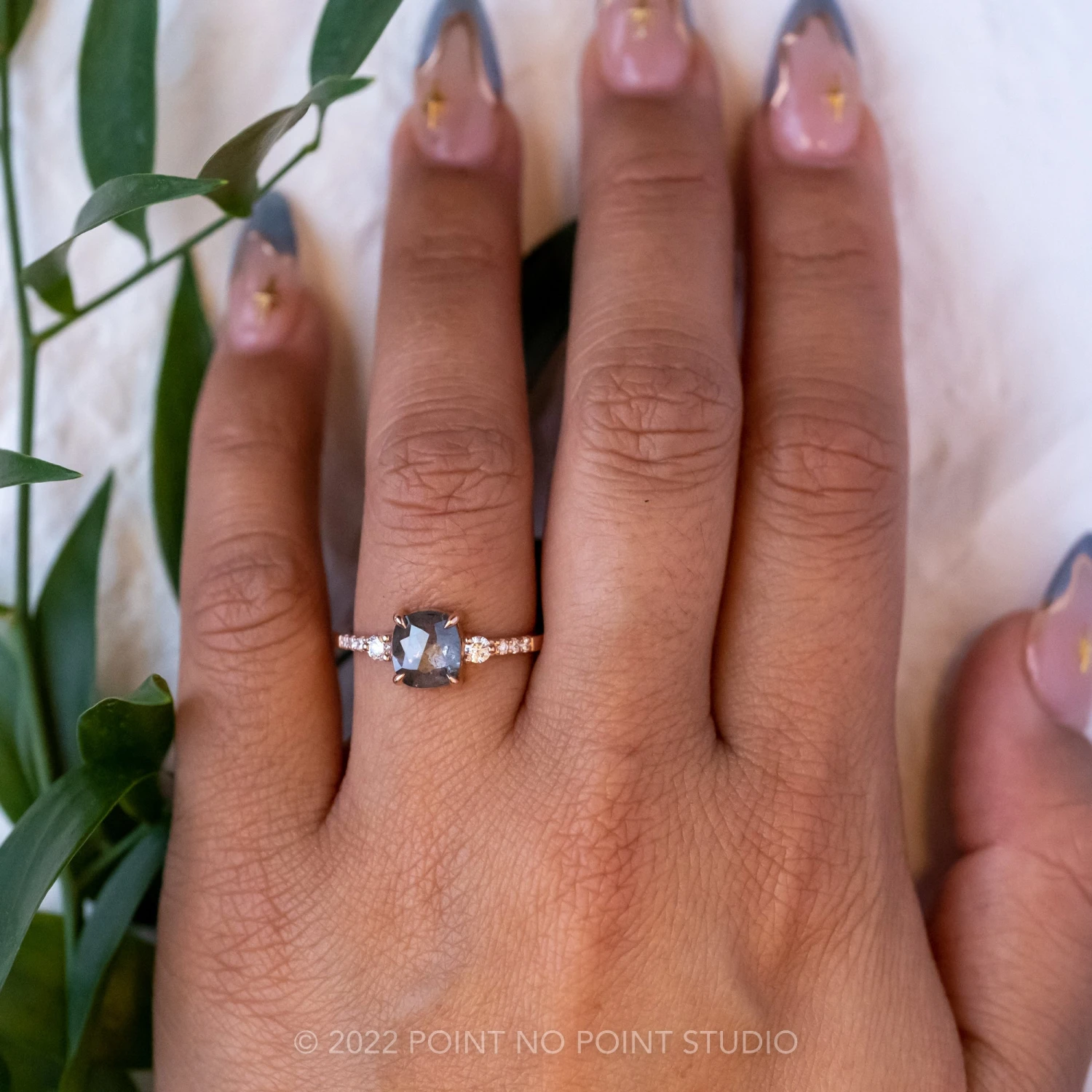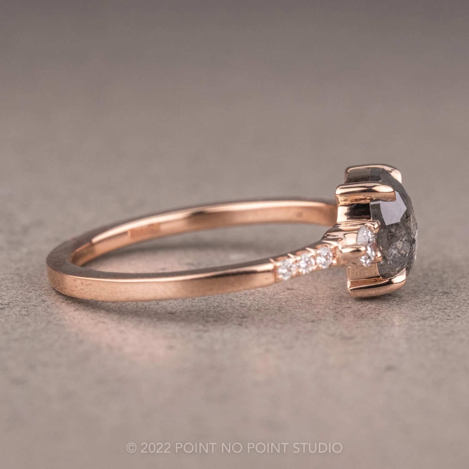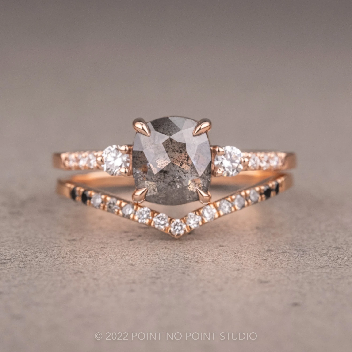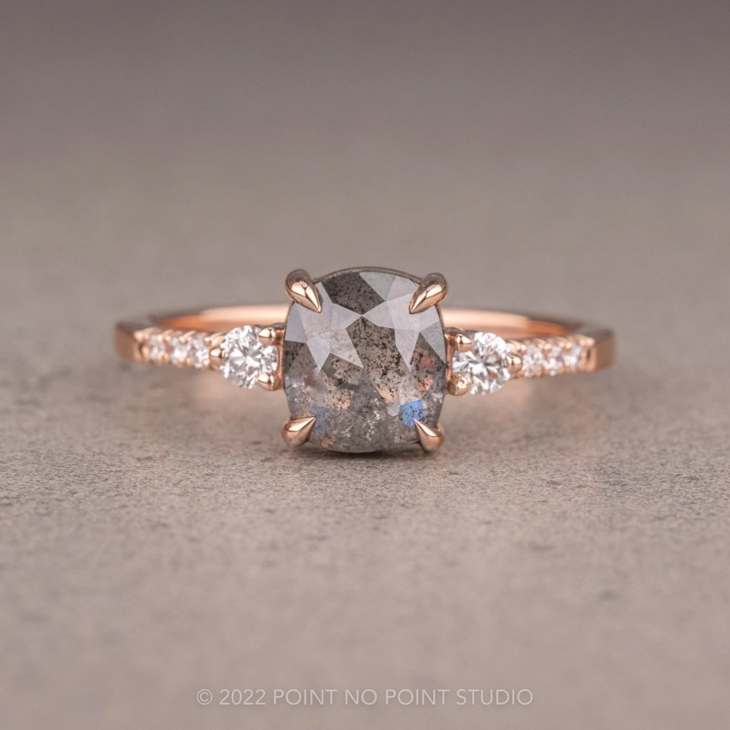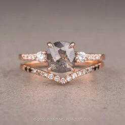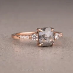 This engagement ring features a mesmerizing and incredibly sparkly 1.08 carat salt and pepper cushion diamond. The diamond is a top quality, un-enhanced natural diamond; it is semi-translucent with unique tones of black and charcoal and facets that catch the light. The rose cut diamond is flanked by .18 tcw GHSI brilliant cut diamonds. The diamond is set into an open back setting so you can see through the diamond and let the light shine through it.Â