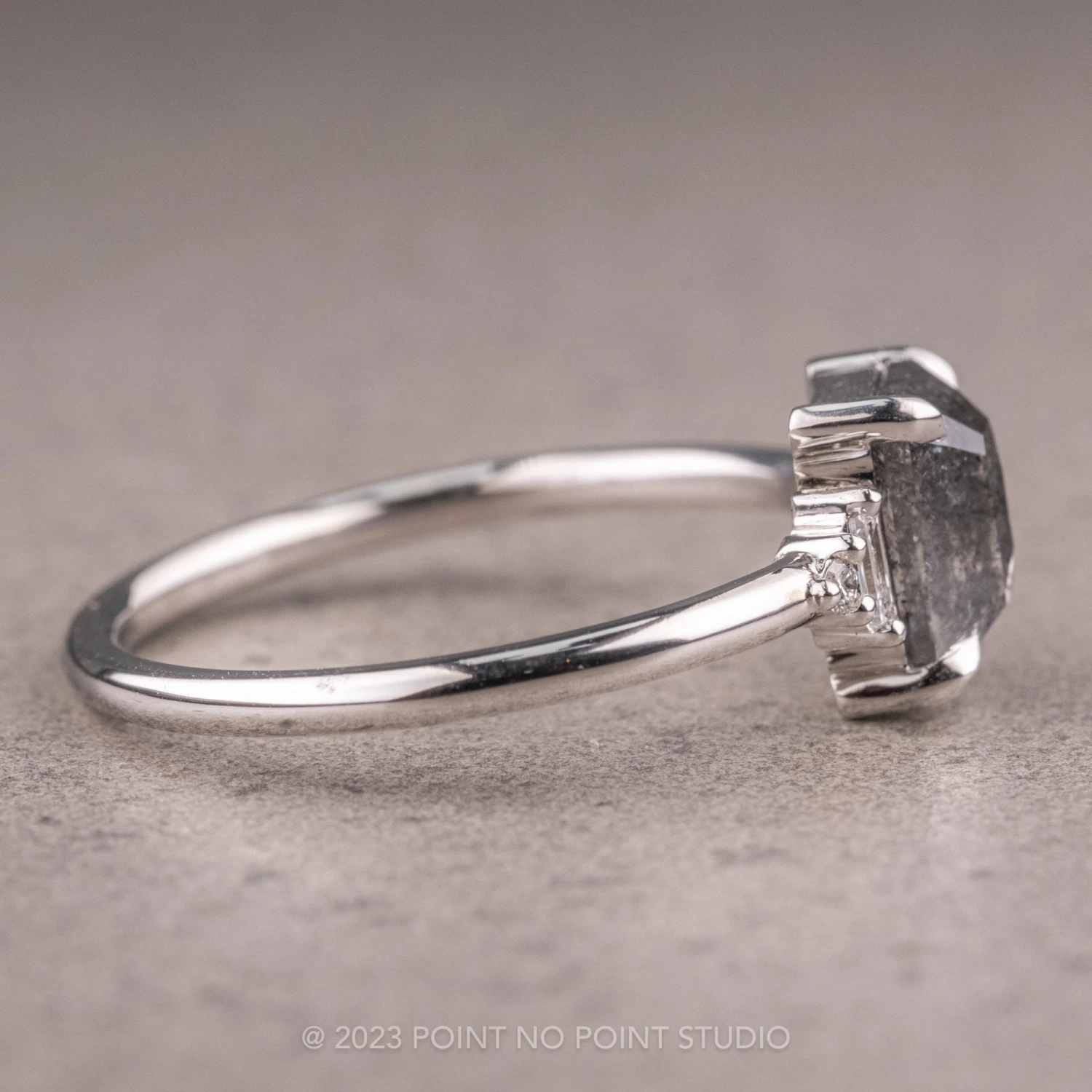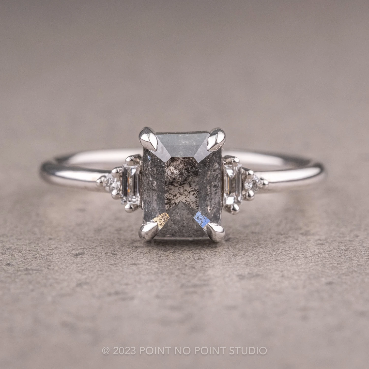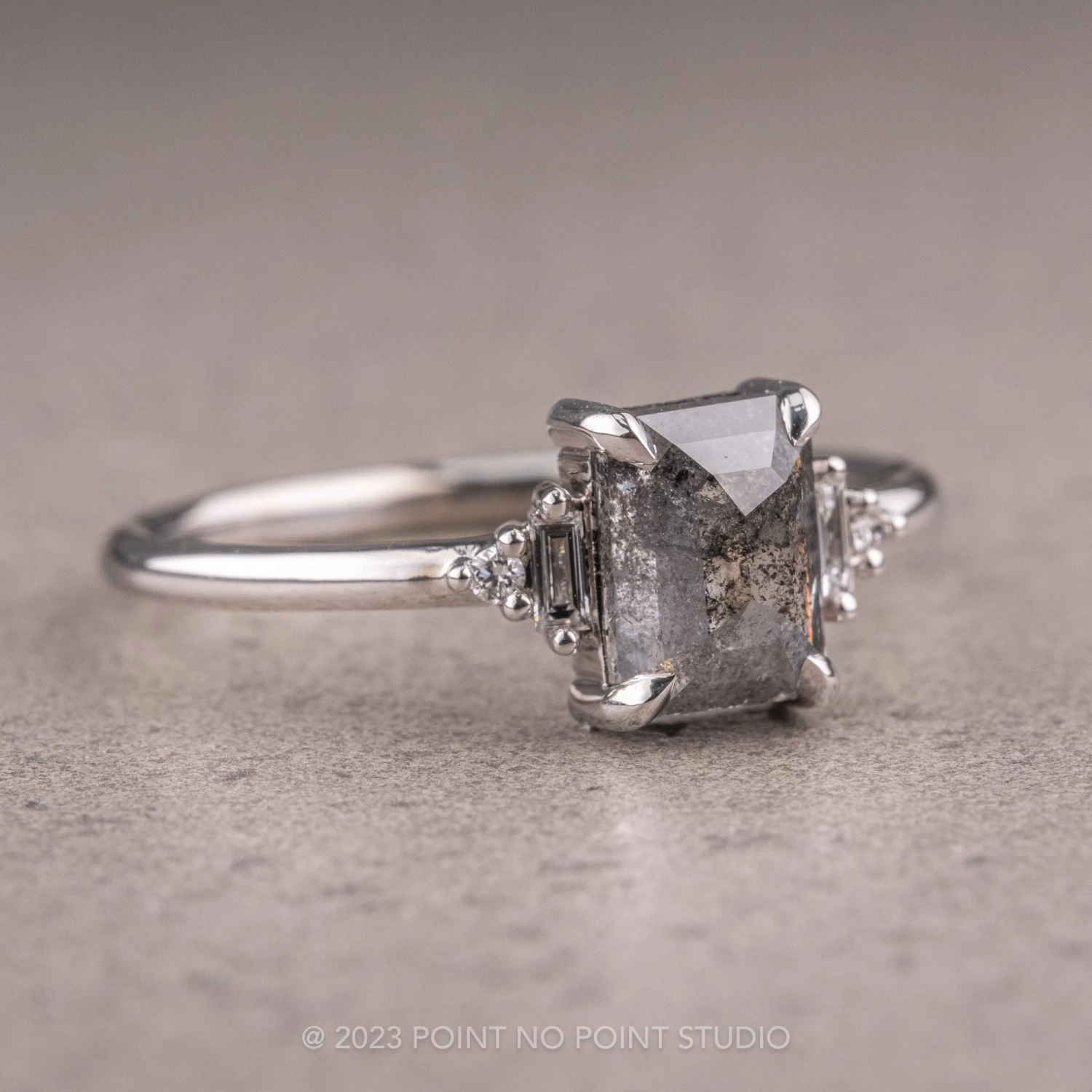 This ring features a stunning 1.19 carat black speckled asscher diamond. The diamond is a top quality, un-enhanced, semi-translucent natural black/grey speckled diamond. Set on either side of the center stone is white baguette diamonds, as well as round white diamonds to complete the look. Â