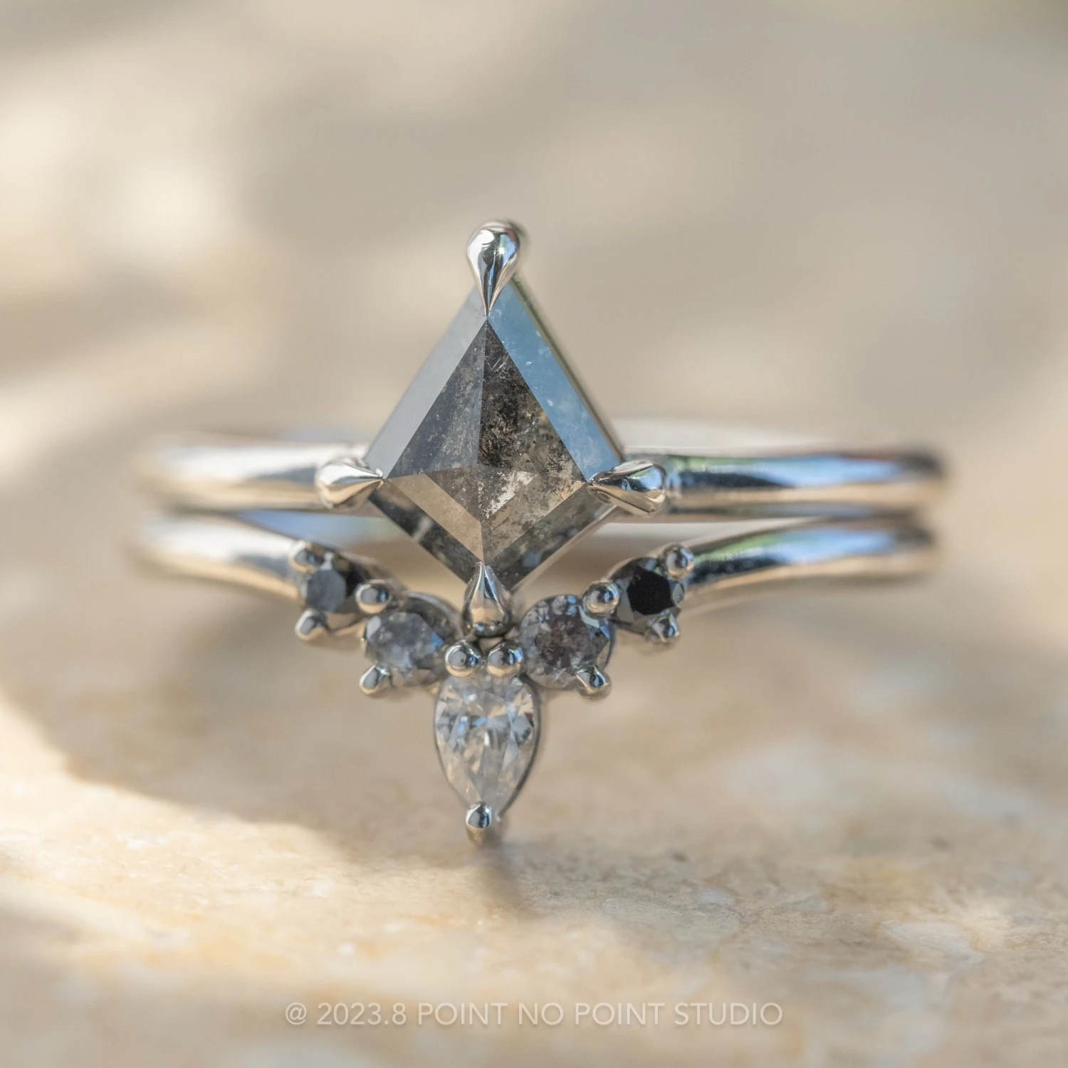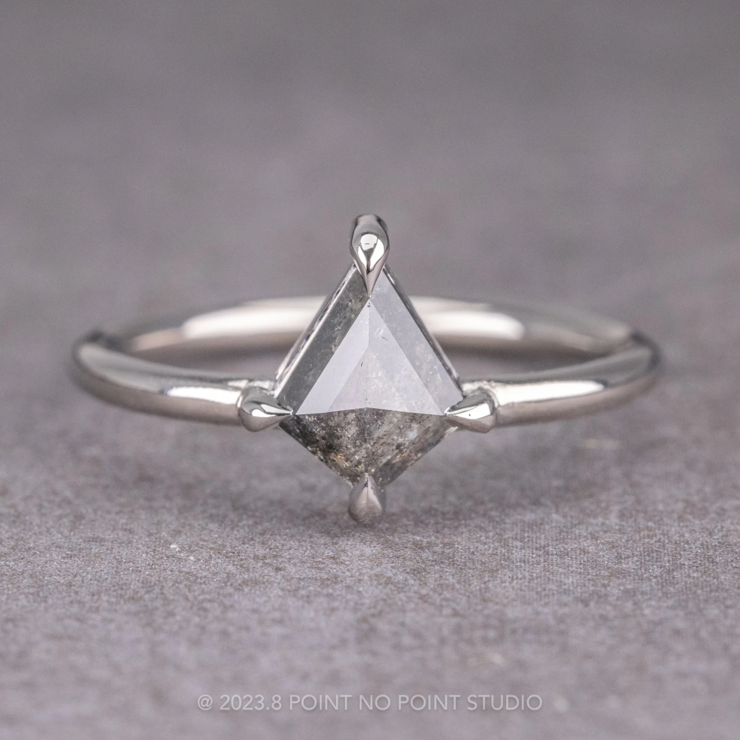 The ring features a beautiful 1.28 carat salt and pepper rose cut kite shaped diamond. The diamond is a top-quality natural diamond that has not been heat treated or enhanced in any way. The kite diamond is set into a 4 prong setting that sits directly on the finger. The ring band has a rounded band profile and is extremely comfortable to wear. This entire ring setting is made from recycled platinum.
