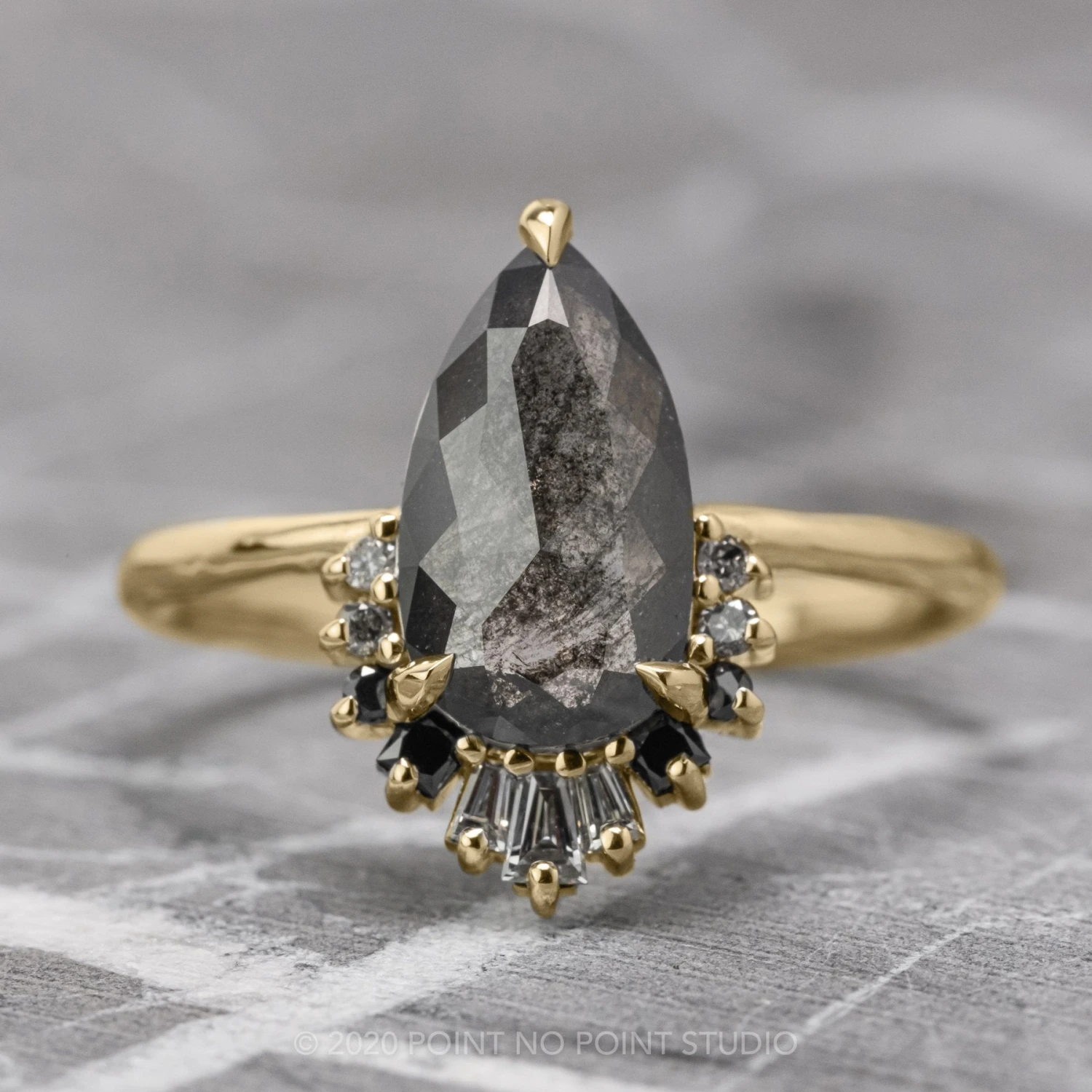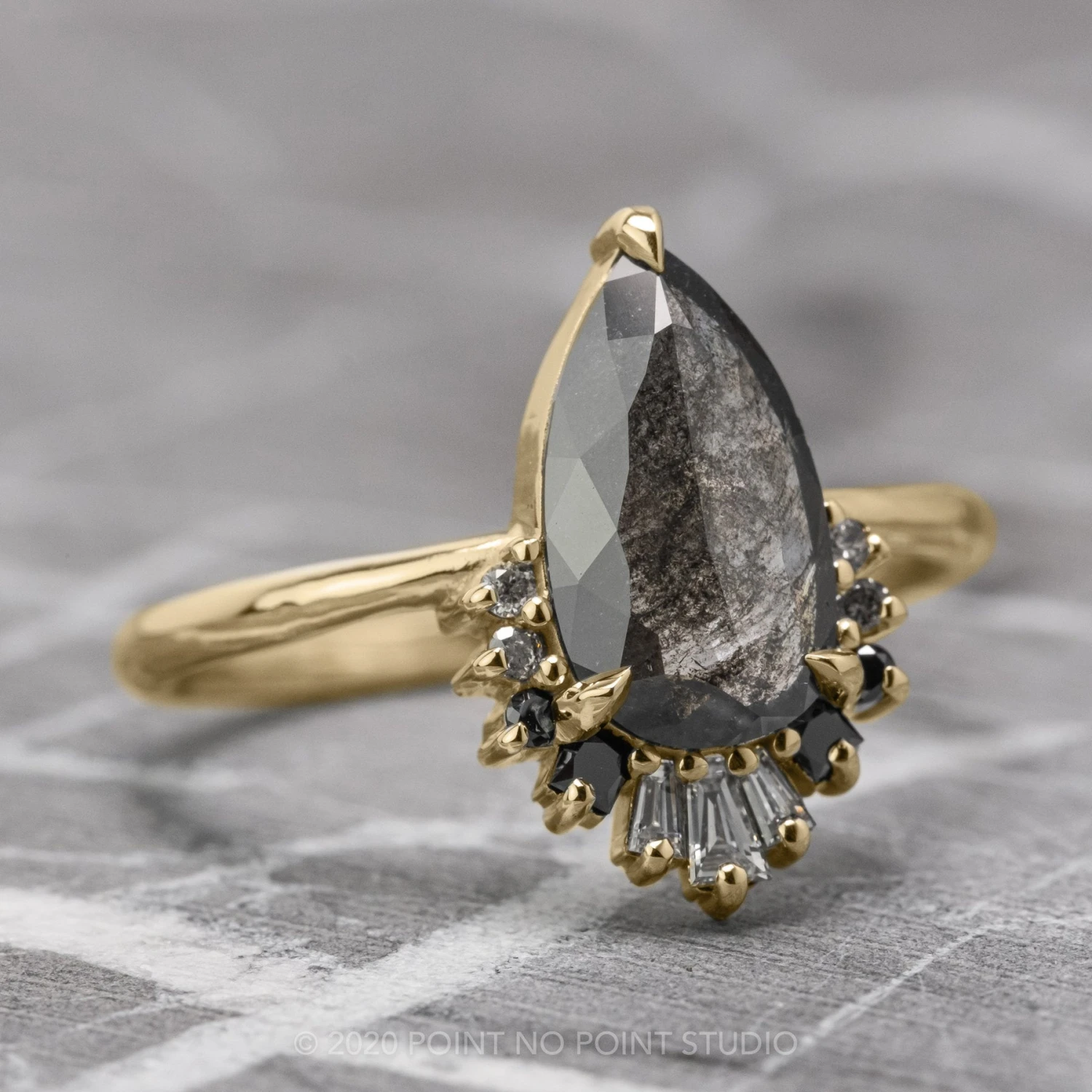 This timeless and unique engagement ring features a striking halo of black, grey & white diamonds in various shapes. The half halo of diamonds sits nestled below a beautiful 1.04 carat black speckled rose cut pear diamond. The pear is a top quality all-natural, un-enhanced diamond that has not been treated in any way; it is semi-translucent with unique inner black speckling.Â