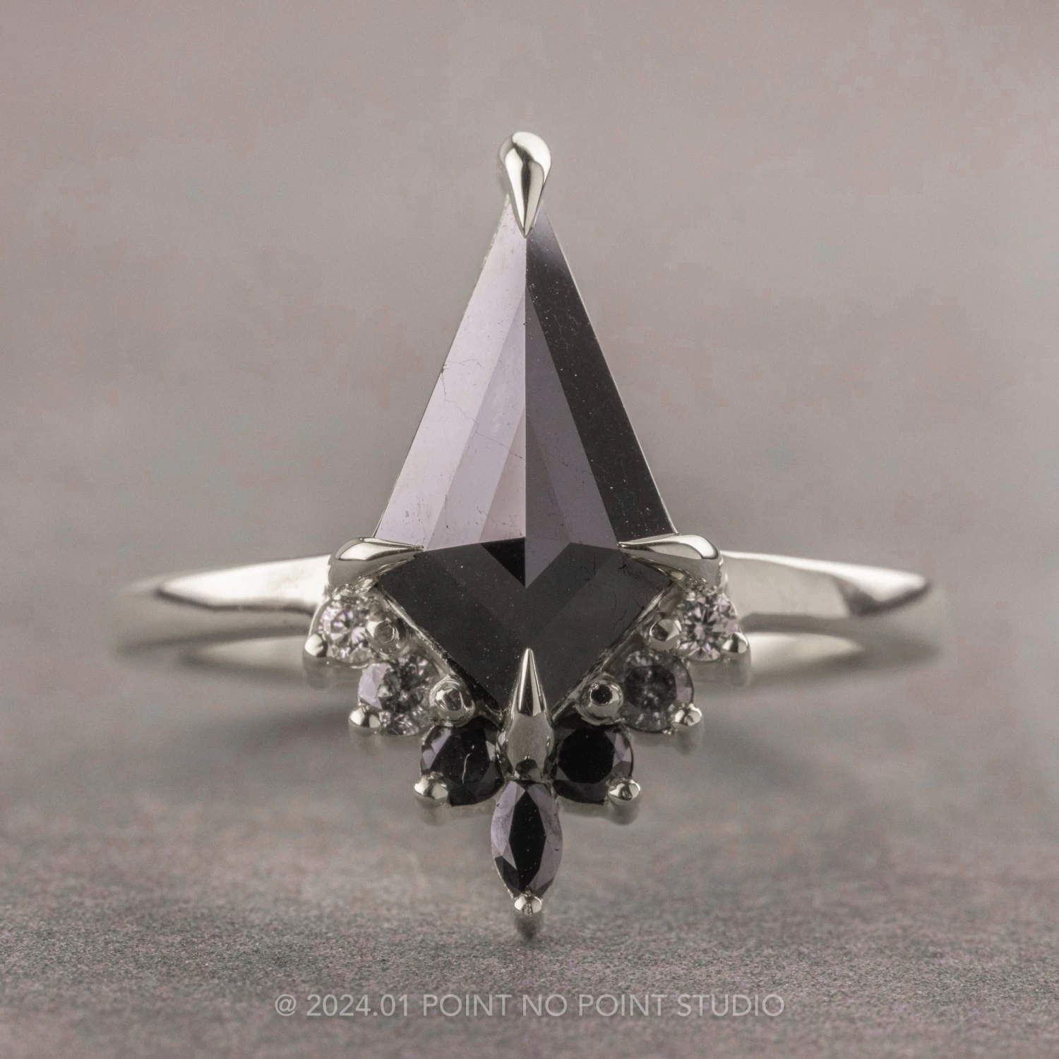 This timeless engagement ring features a striking 1.14 carat opaque black kite shaped diamond. The diamond is a top quality diamond and has been set in a low profile prong setting with a half-halo of faceted ombre diamonds with the focal point being a black marquise diamond.Â