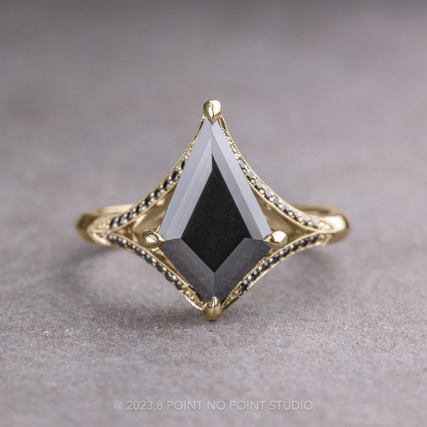 This magical ring features a stunning hand-faceted black kite moissanite. The moissanite is set into an open basket setting to allow light to illuminate through the stone. This unique setting has diamonds micro pave set around the band to give it that extra sparkle! Each of the seat for these accent diamonds is carved by hand which gives it a vintage feel and extra shine finish behind each of the tiny diamonds. The small diamonds in the band is accentuated by hand engraved milgrain.
