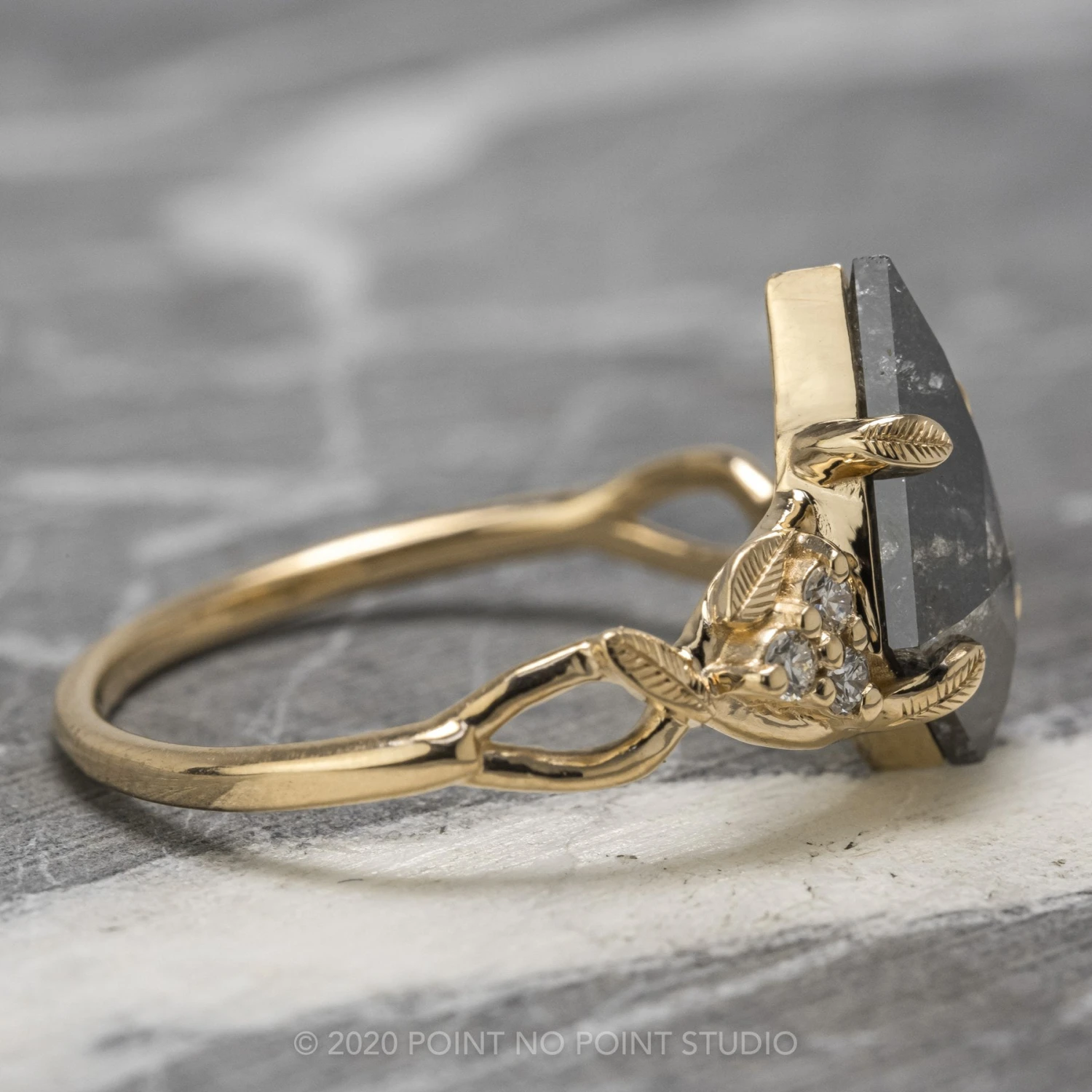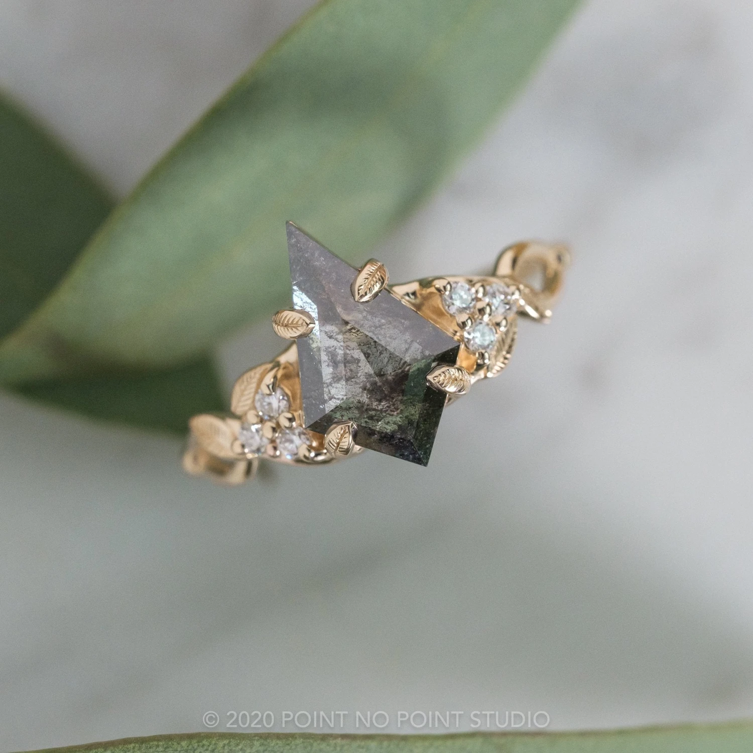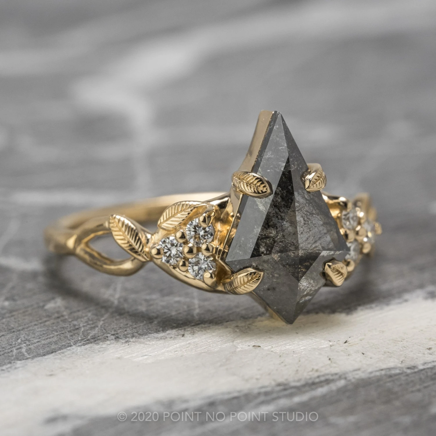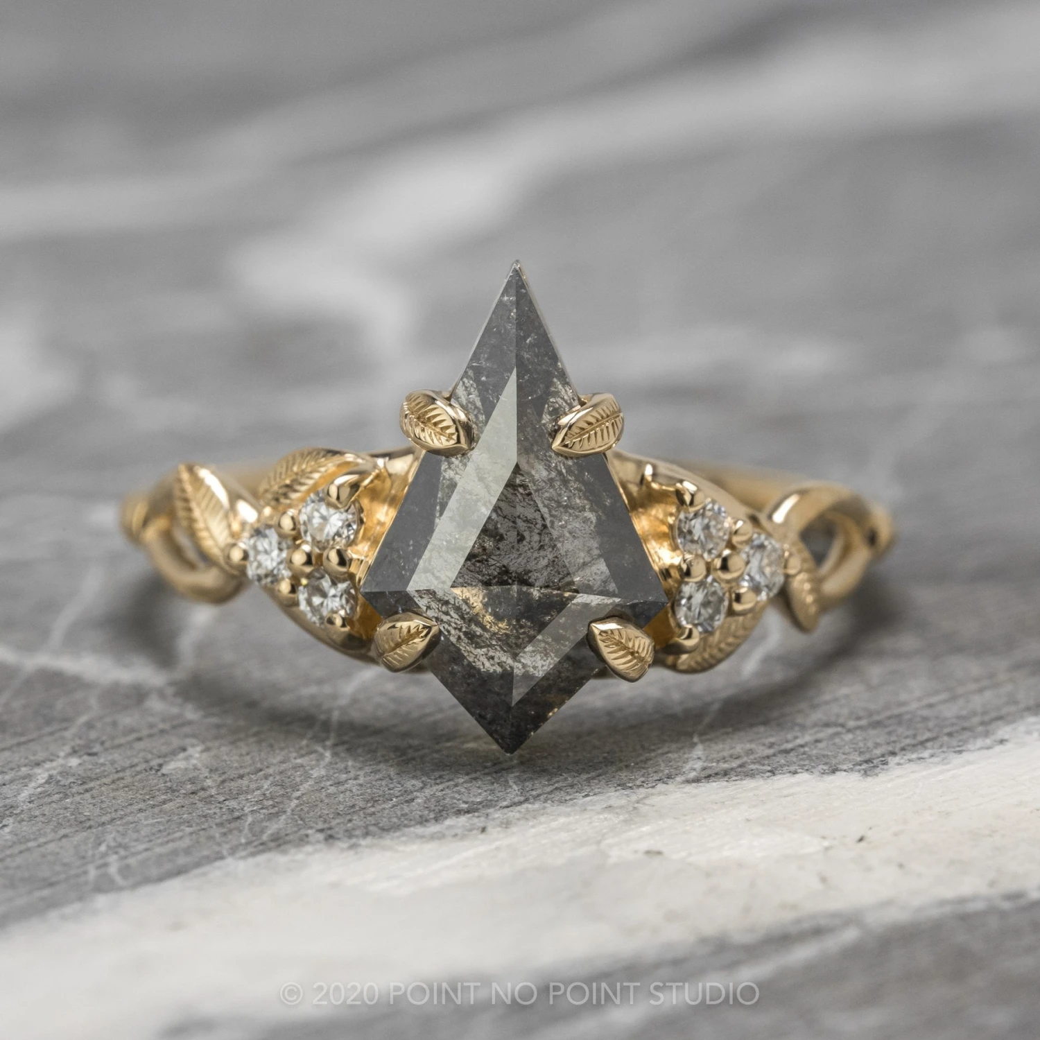 The ring features a 1.28 carat black speckled kite shaped diamond. The kite shaped diamond and the diamonds in the setting are all conflict free. This vintage inspired setting has a leaf pattern that has been hand engraved with a cluster of GH-SI brilliant cut white round diamonds on either side of the center stone. Â