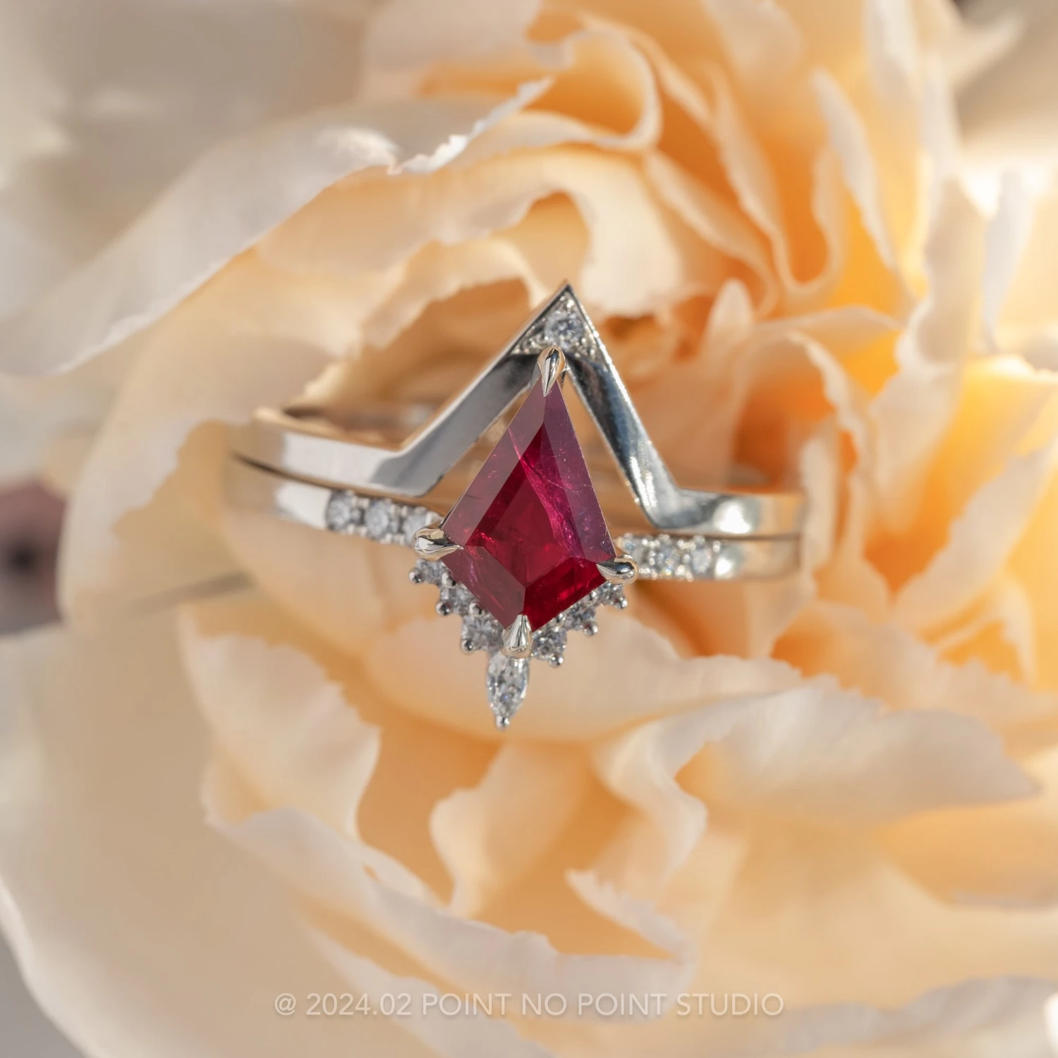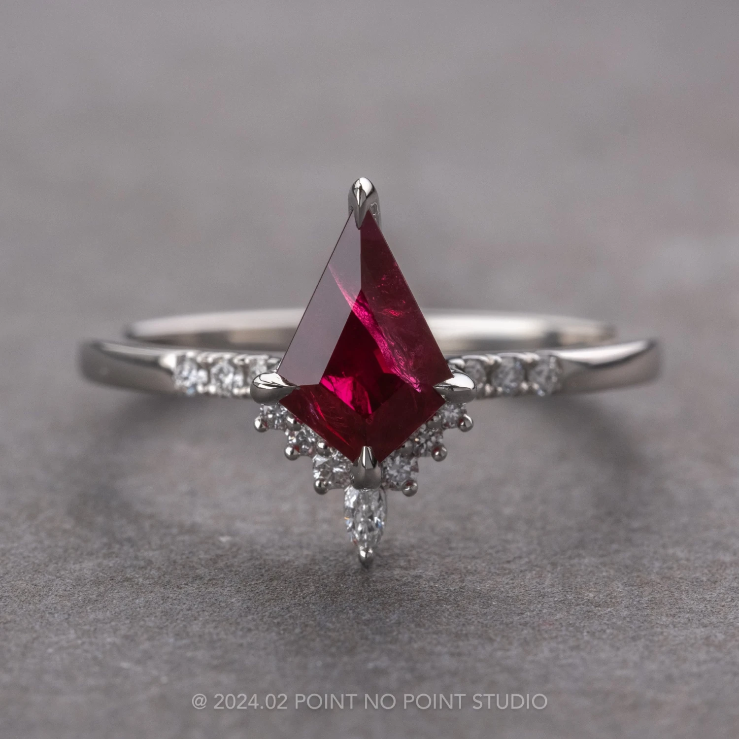 This timeless engagement ring features a 1.25 carat brilliant cut kite shaped ruby. The ruby is a top quality natural stone that has not been treated or heated in any way. Natural, kite shaped rubies are extremely rare. The ruby sits within a half-halo of GHSI faceted white diamonds with the focal point being a stunning marquise shaped diamond. Set into the band are three GHSI white round accent diamonds for that extra sparkle!