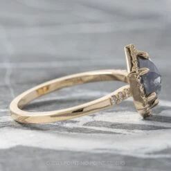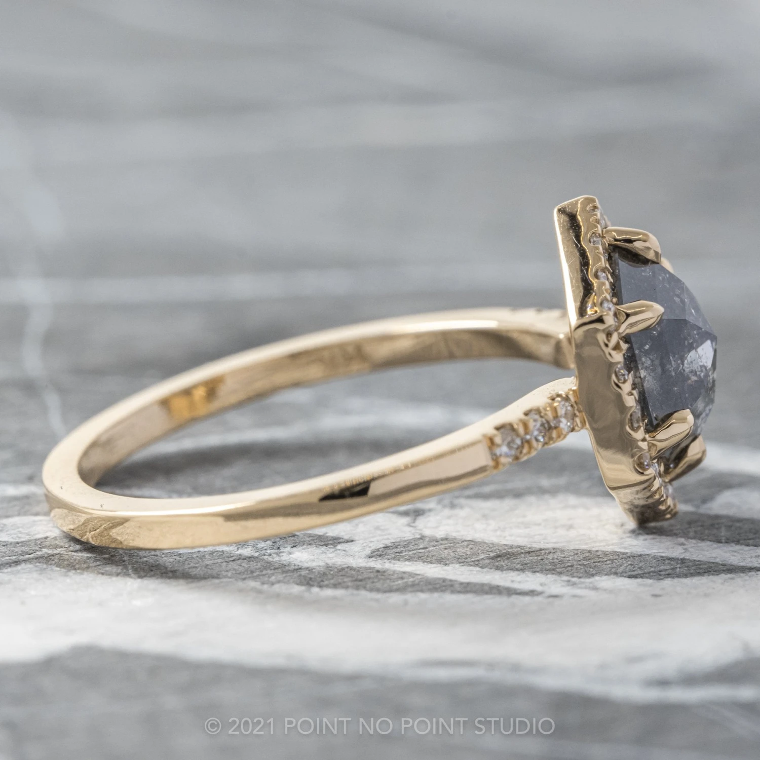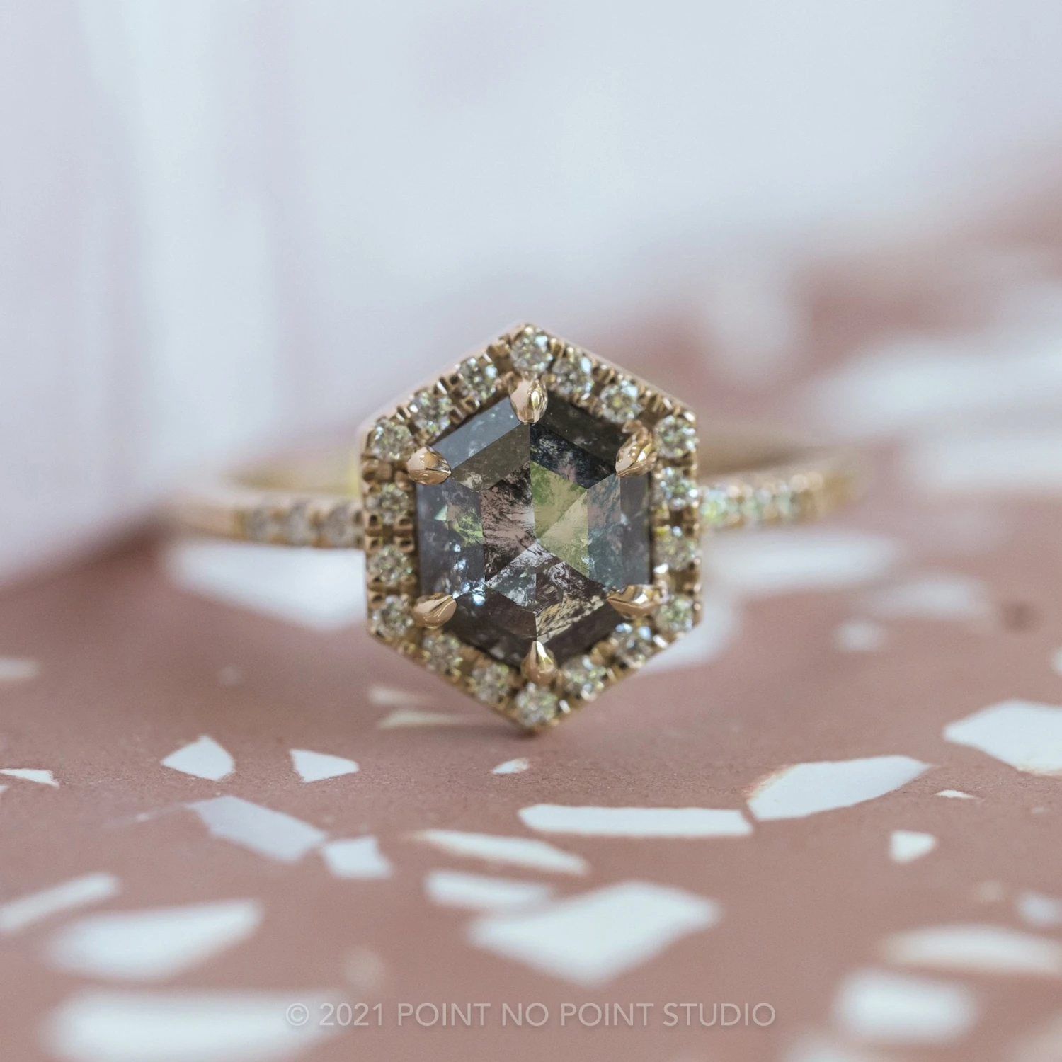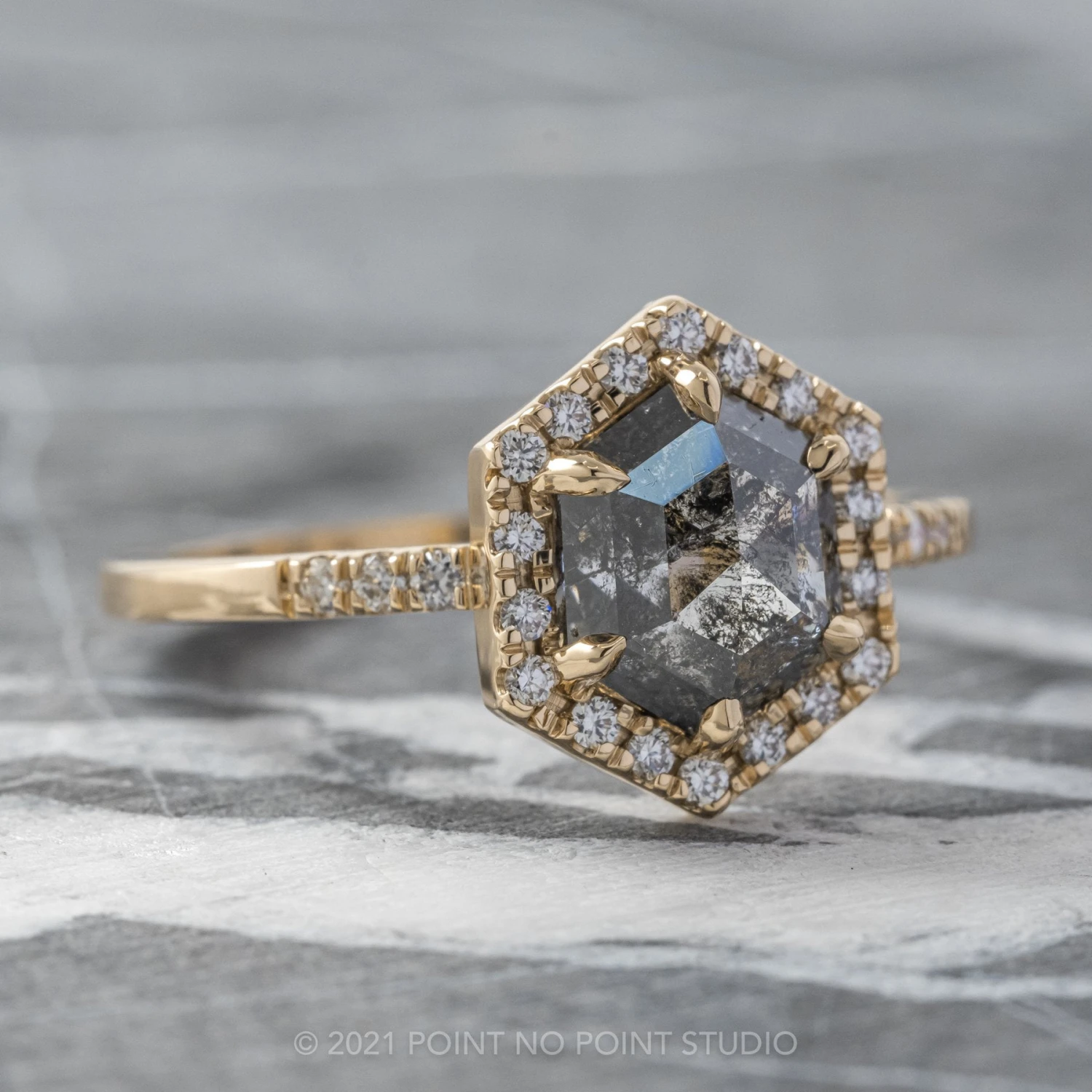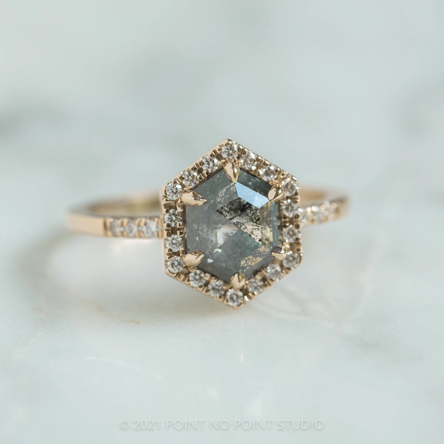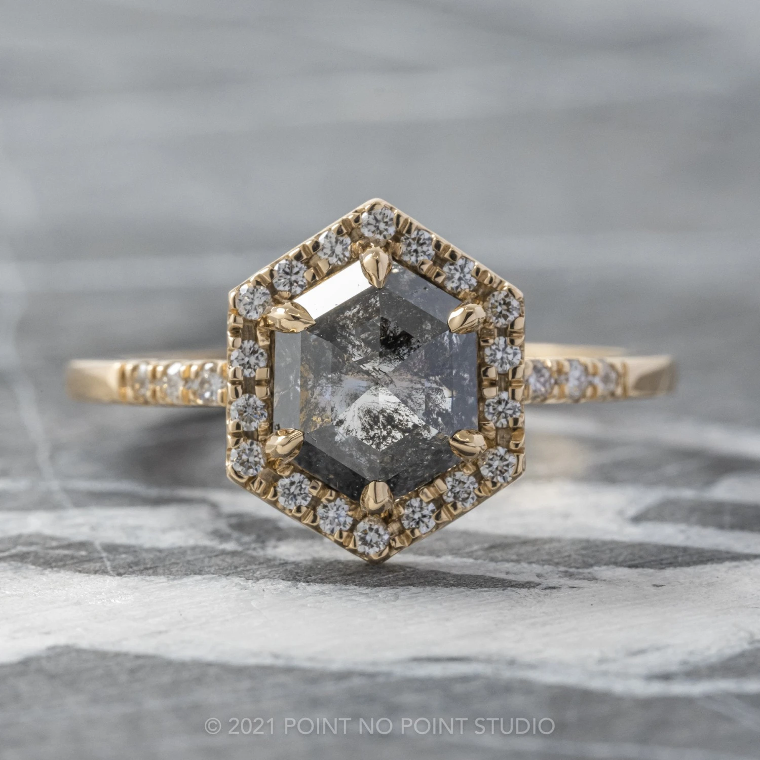 The ring features a beautiful 1.10 carat salt and pepper hexagon rose cut diamond. The diamond is a top quality natural diamond and has been set in a low profile 4-prong setting. The center diamond is surrounded by a halo of GH-SI white diamonds, along with diamonds in the ring band for that extra sparkle!