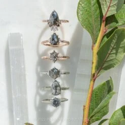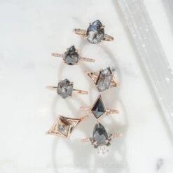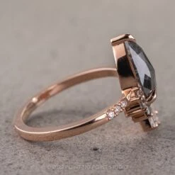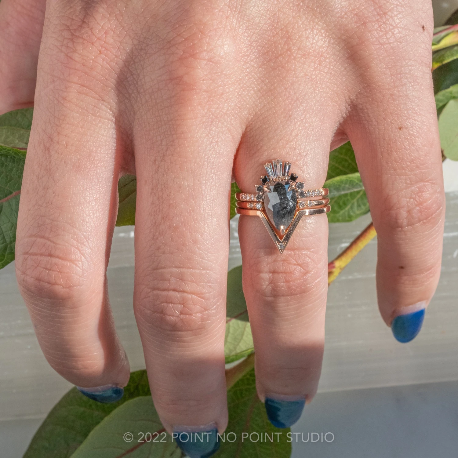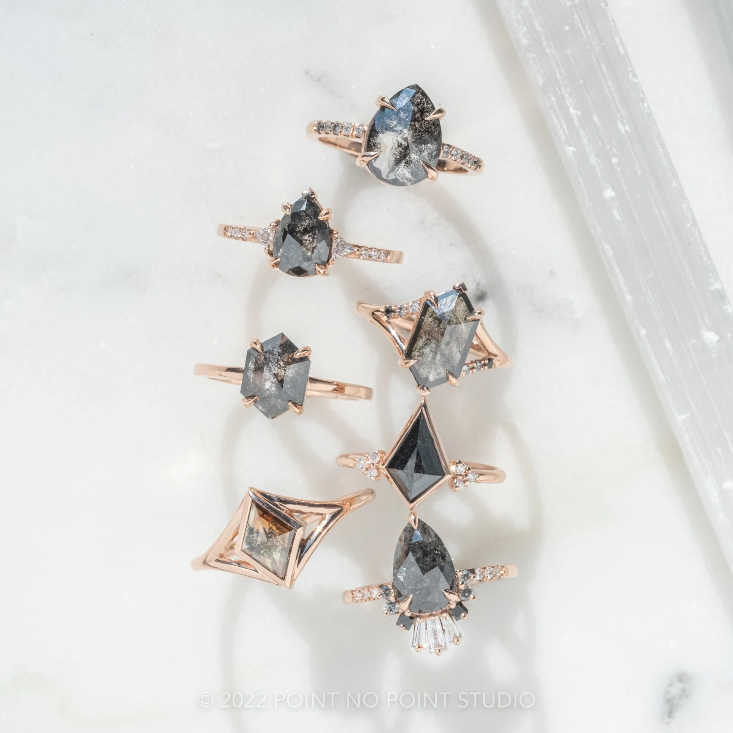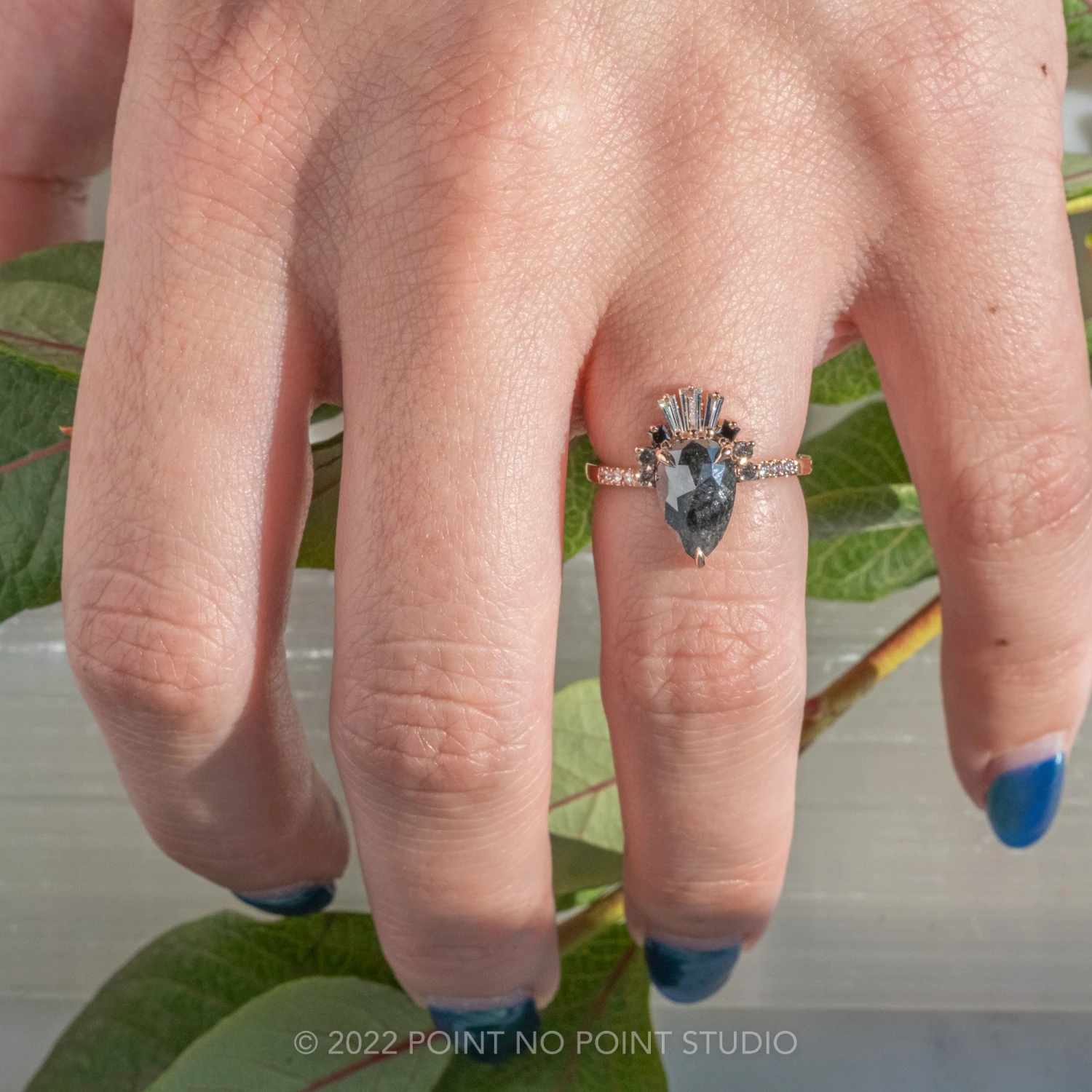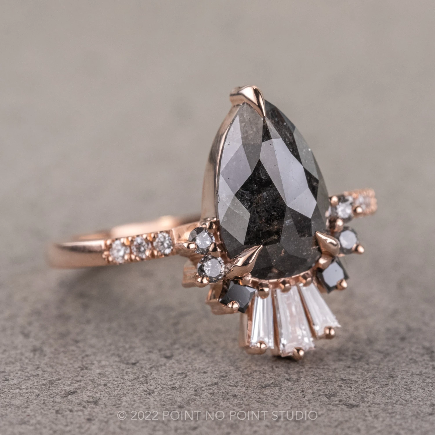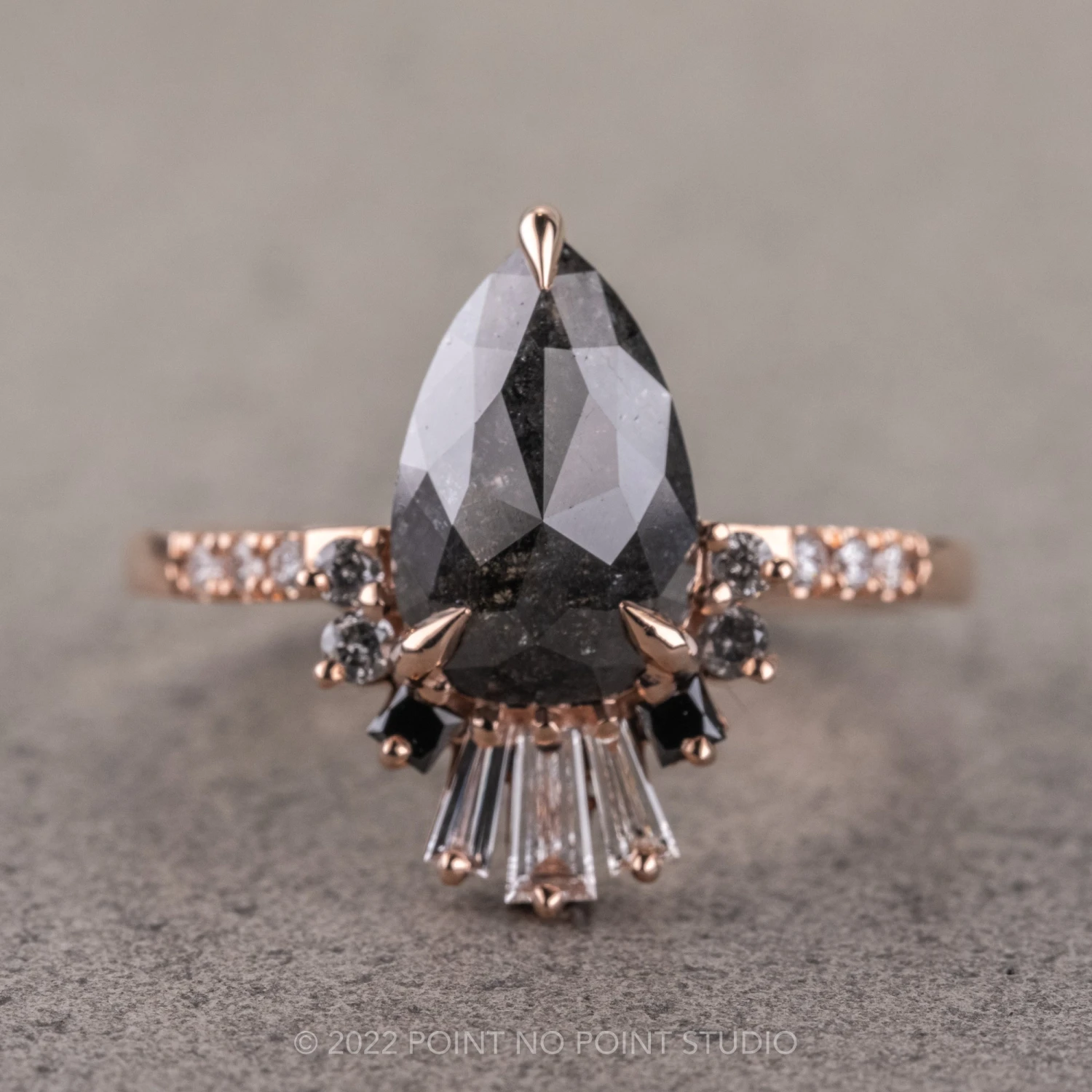 This timeless and unique engagement ring features a striking halo of black, grey, and white diamonds in various shapes. The half halo of diamonds sits nestled below a beautiful .99 carat black speckled pear rose cut diamond. The diamond is an all-natural, top-quality stone and is semi-translucent with black speckles. The ring is finished with three GHSI white brilliant cut round diamonds down each side of the ring band.