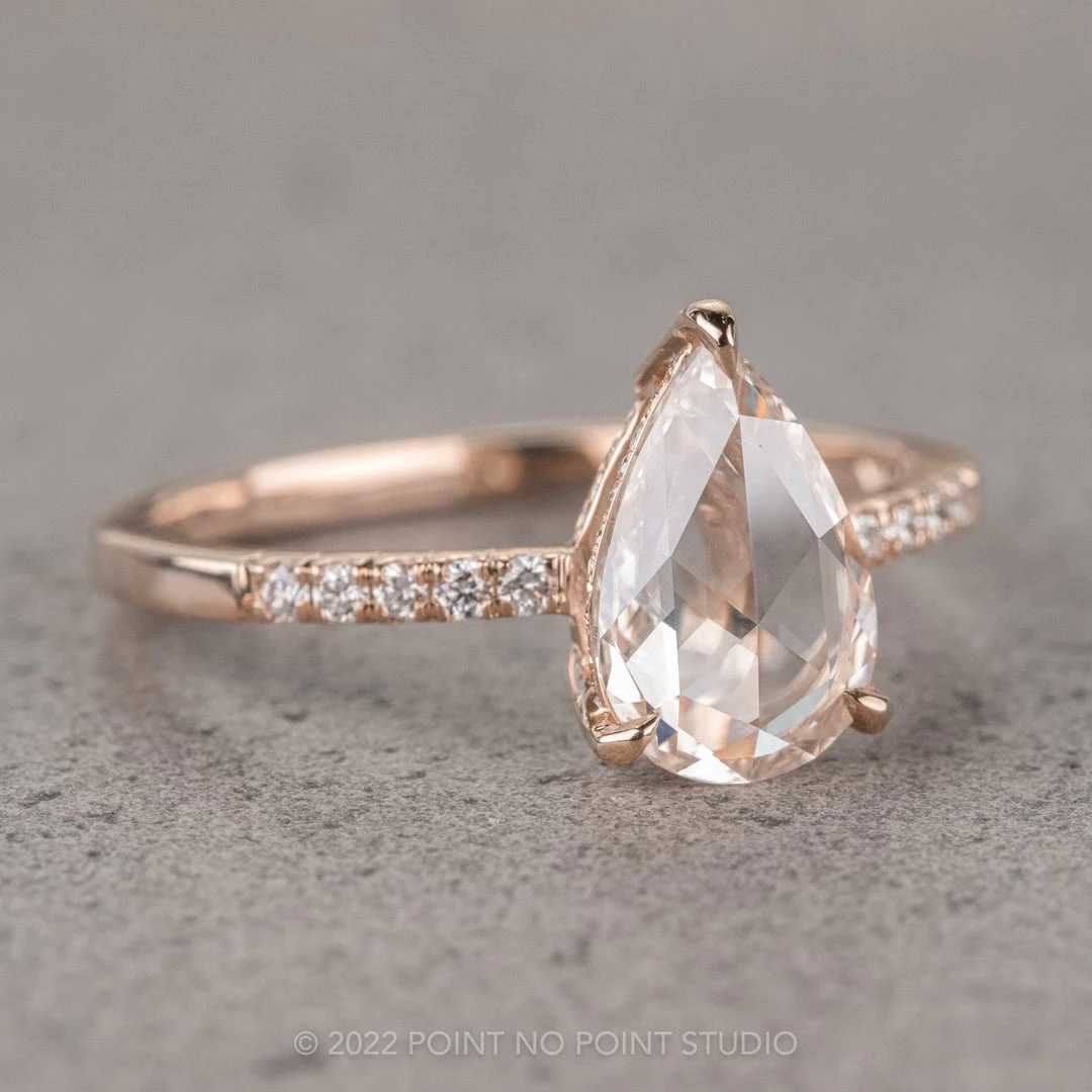 The entire ring is made of recycled 14k rose gold; the ring band is extremely comfortable to wear. The 3 prong raised basket setting for the diamond sits slightly raised off the finger