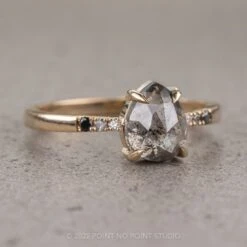 This captivating ring features a beautiful 1.34 carat pear rose cut diamond. The diamond is a top quality natural stone, the color of the diamond is translucent with salt and pepper speckles. Each side of the pear diamond has one white, grey, and black diamond set into the ring shank which is slightly tapered.