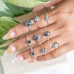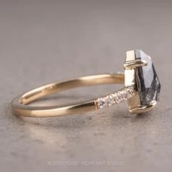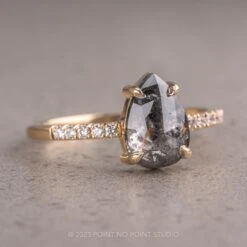 This engagement ring features a mesmerizing 1.38 carat salt and pepper pear double cut diamond. The diamond is a top quality un-enhanced diamond; it is semi-translucent with unique tones of black and charcoal and facets that catch the light. Set into the band on either side of the diamond are five white brilliant cut accent diamonds, adding beautiful illuminating contrast to the center diamond.Â