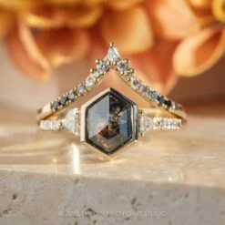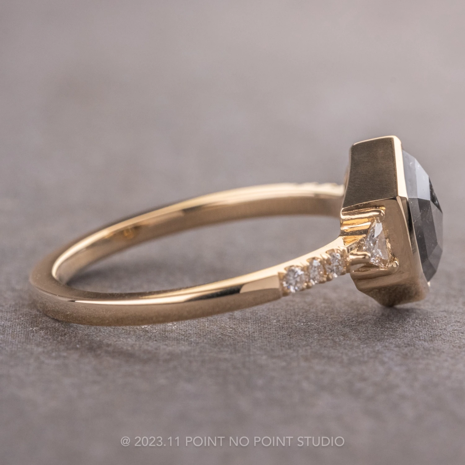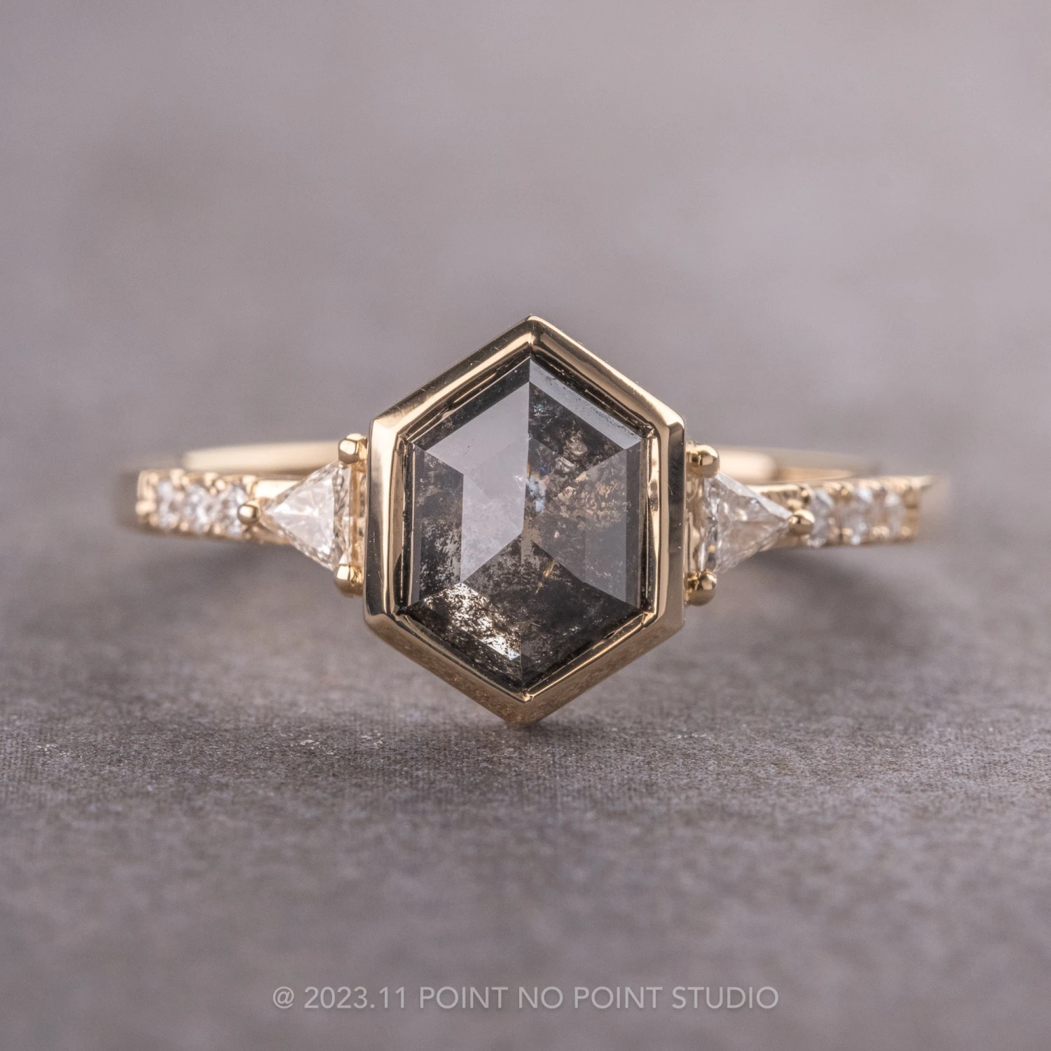 This engagement ring features a mesmerizing 1.37 carat black speckled rose cut hexagon diamond. The diamond is a top quality un-enhanced diamond; it is semi-translucent with unique tones and facets that catch the light. Flanked on either side by GHSI white triangle diamonds, followed by GHSI round accent diamonds set into the band for that extra sparkle!