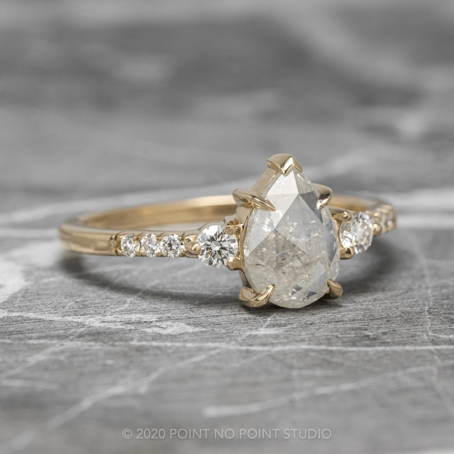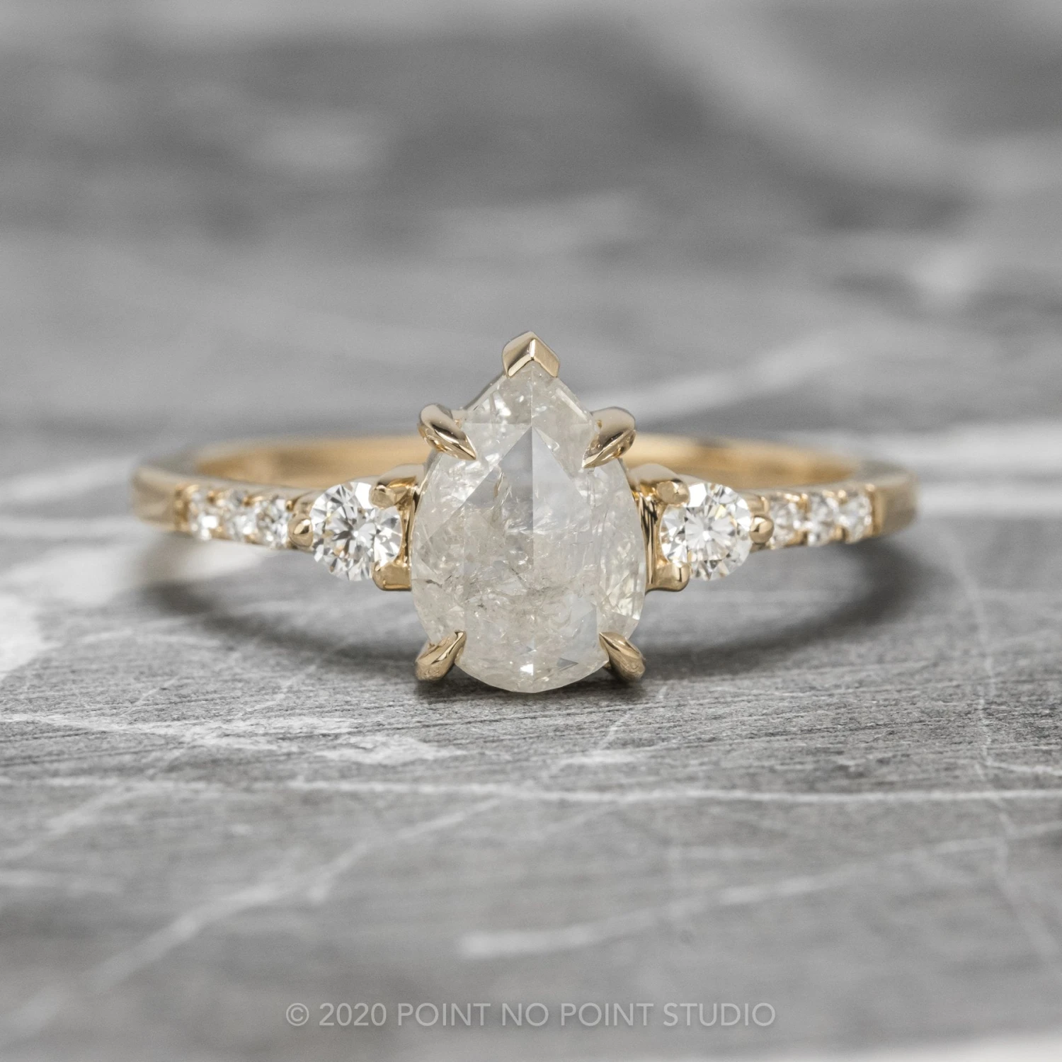 This beautiful and dainty ring features a gorgeous 1.34 carat icy white pear rose cut diamond. The rose cut diamond is flanked by .18 total carat weight of GHSI brilliant cut diamonds. The diamond is set into an open back setting which allows you to see and admire the unique inner structure, tones, and marbling of the diamond.
