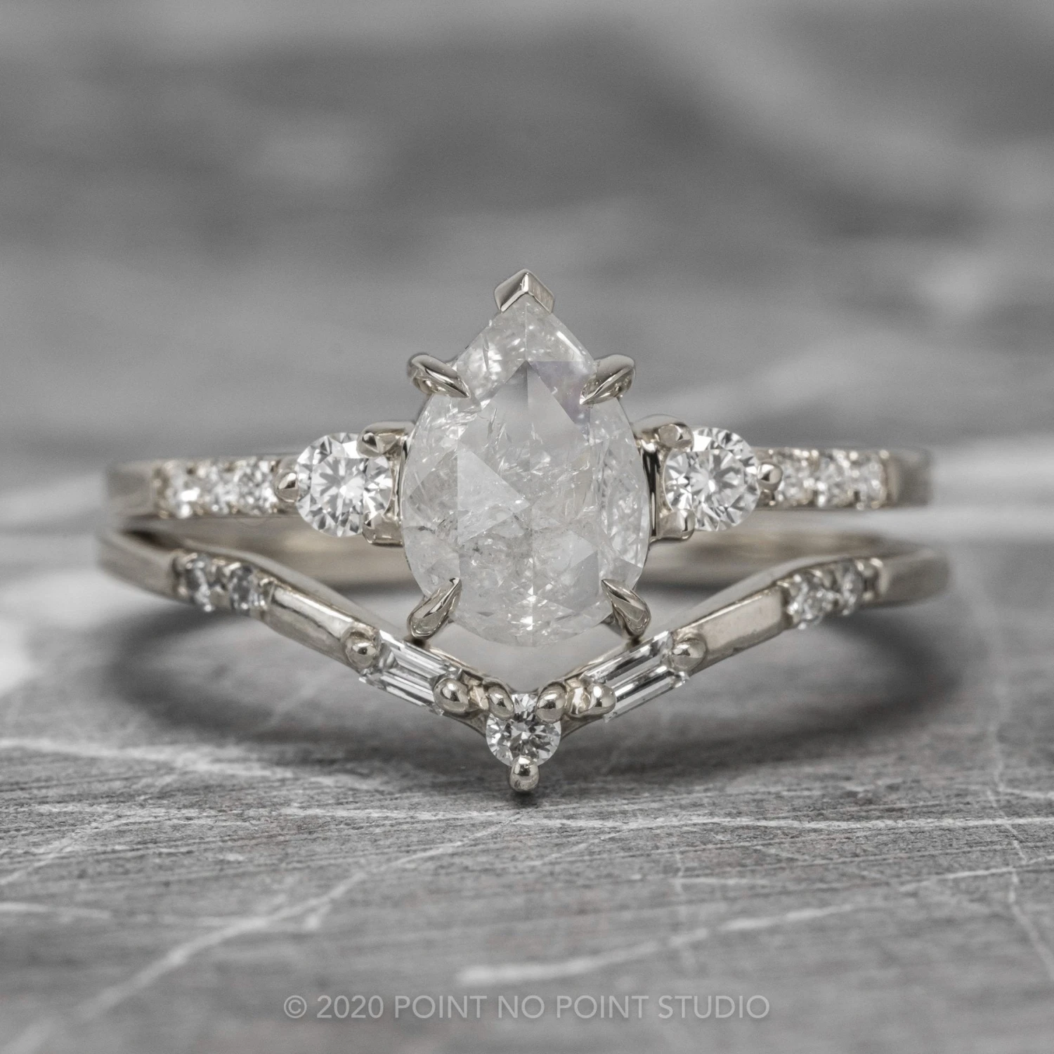 This beautiful and dainty ring features a gorgeous 1.34 carat icy white pear rose cut diamond. The rose cut diamond is flanked by .18 total carat weight of GHSI brilliant cut diamonds. The diamond is set into an open back setting which allows you to see and admire the unique inner structure, tones, and marbling of the diamond.
