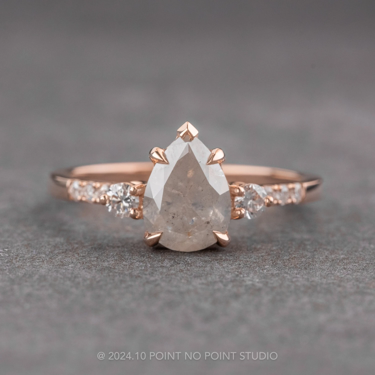 This engagement ring features a mesmerizing and incredibly sparkly 1.35 carat icy white pear shaped brilliant cut diamond. The pear diamond is a top quality natural diamond; it is semi-translucent with unique tones and facets that catch the light. Flanked on both sides by a GHSI white round brilliant cut accent diamond, followed by three smaller GHSI white round brilliant cut diamonds set into the ring band to complete the look!