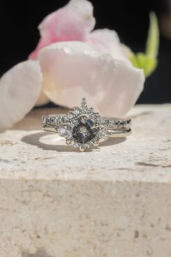 This ring features an all natural stunning 1.41 carat salt and pepper round brilliant cut diamond. The hand cut diamond is a top quality natural, non enhanced or treated diamond and is semi-translucent with unique tones and facets that catch the light beautifully! Flanking the center diamond are sparkly GHSI white round accent diamonds to complete the look.Â