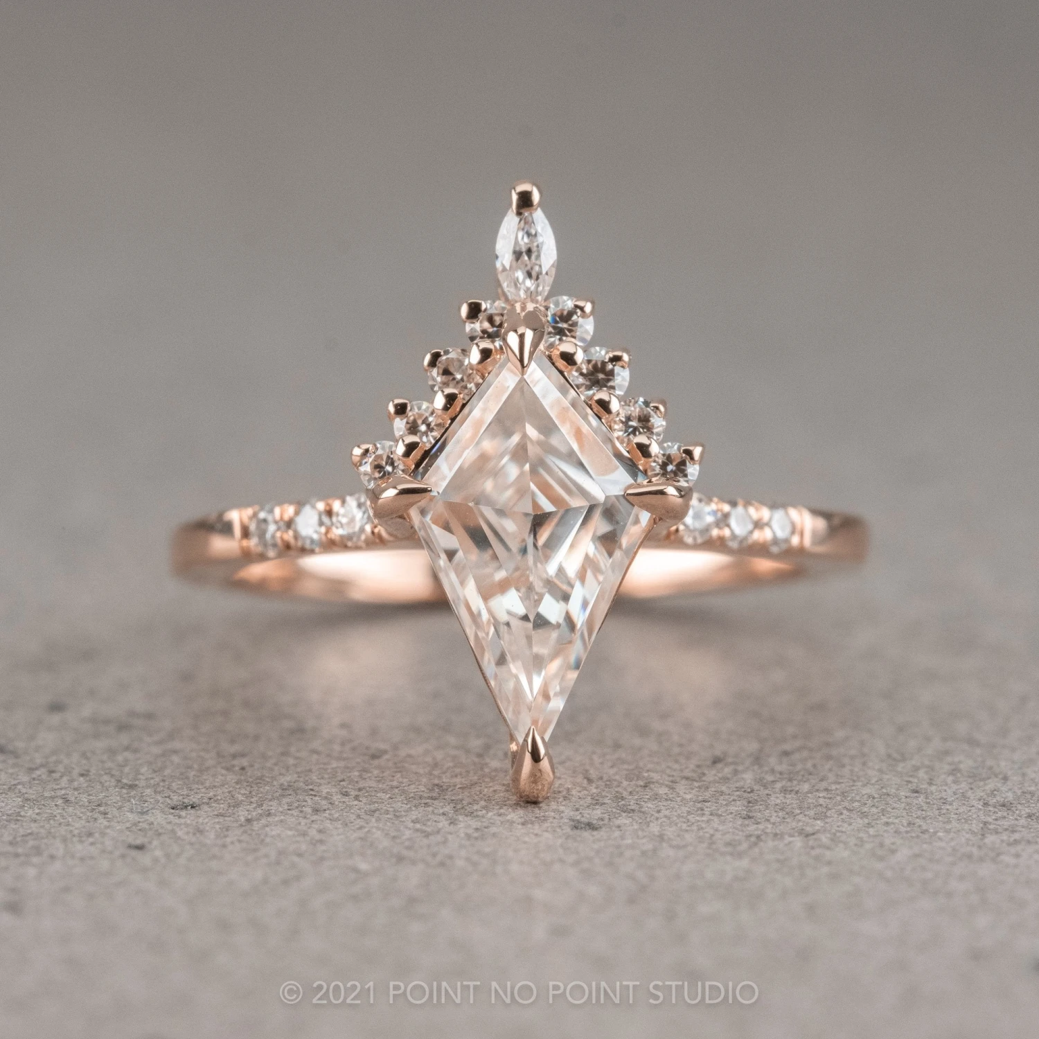 This timeless engagement ring features a stunning kite moissanite. The moissanite has been set in a low profile prong setting with a half-halo of faceted white moissanite. The entire ring is made of 14k rose gold.Â
