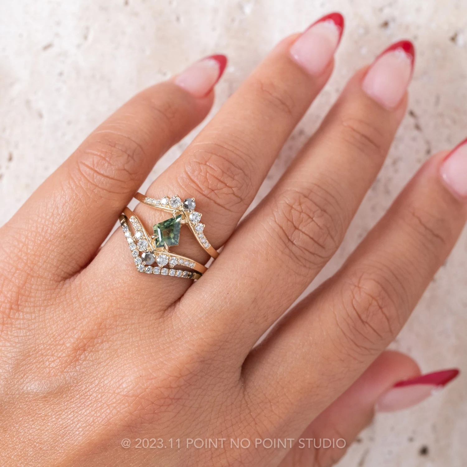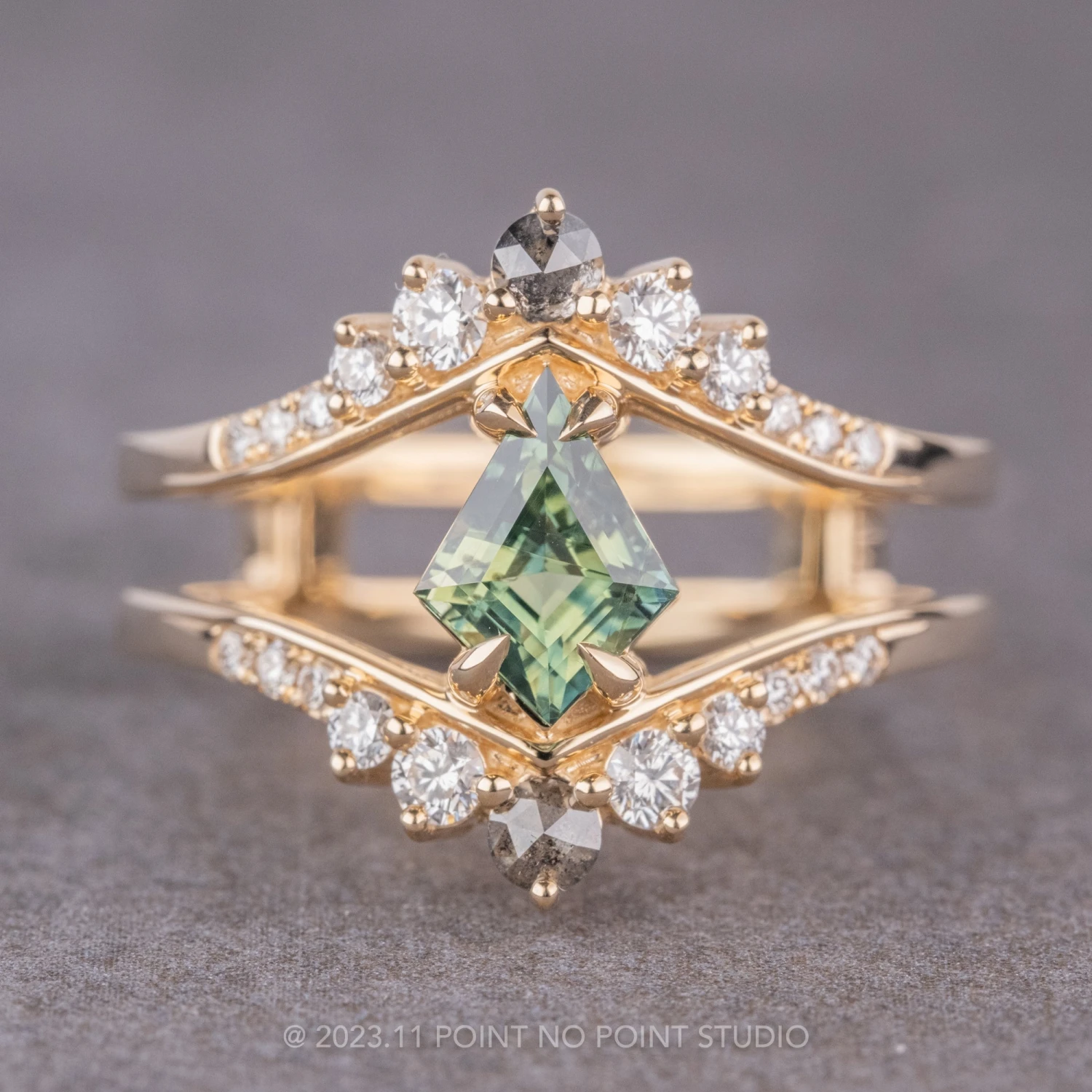 This amazing ring features a gradient tone of natural diamonds. The center stone is a natural 1.03 carat brilliant cut green kite sapphire. The double band design features grey and white natural diamonds. The geometric center sapphire is flanked on either side by two crown like diamond setting bands. The entire ring is made of recycled 14k yellow gold.Â