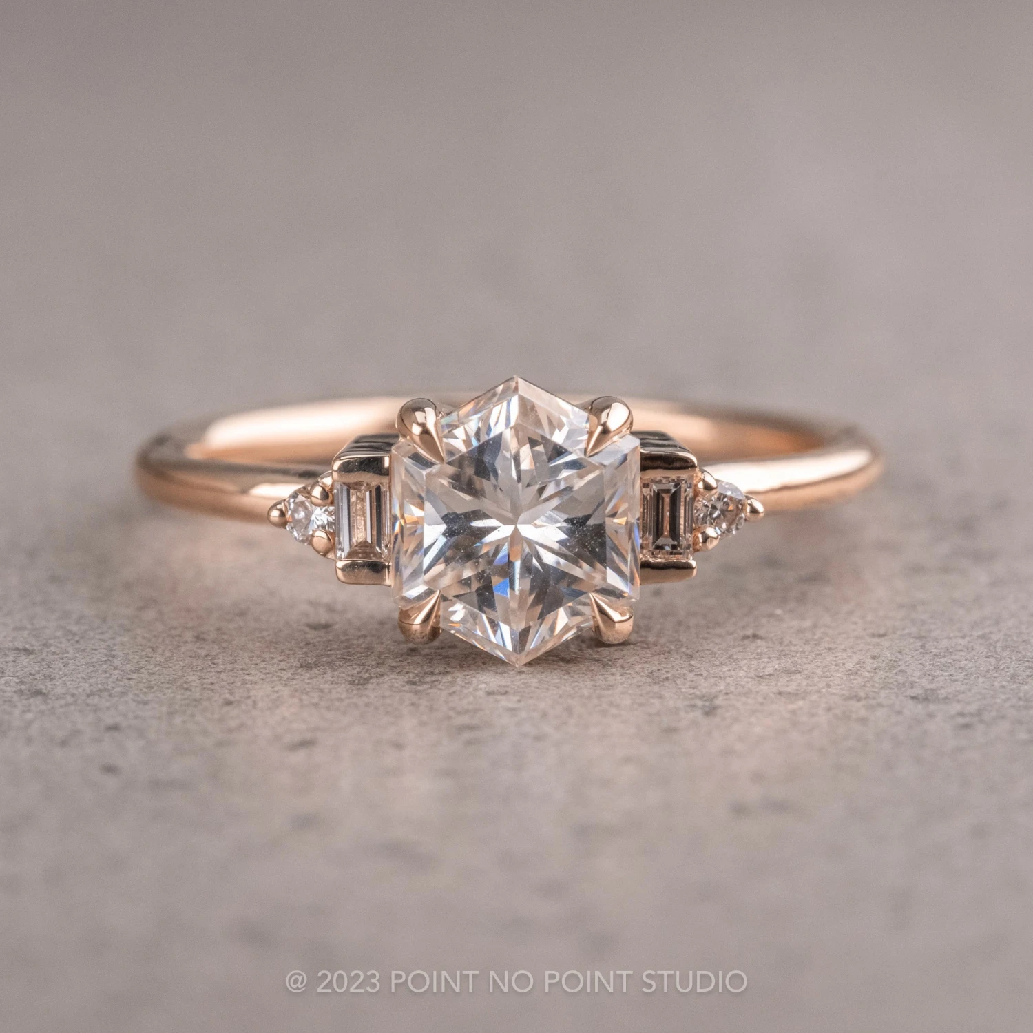 This ring features a stunning 1.46 carat hexagon brilliant cut moissanite. Set on either side of the center stone are GHSI white baguette diamonds, as well as round white diamonds to complete the look.