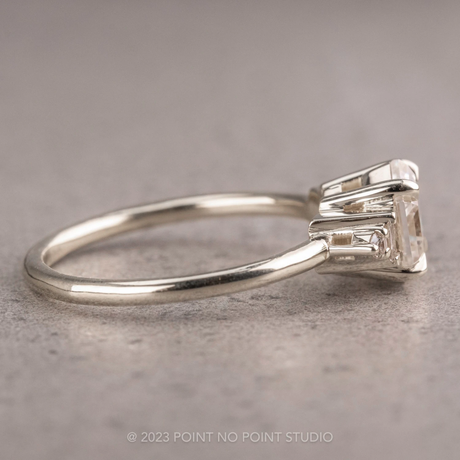 This ring features a stunning 1.46 carat hexagon brilliant cut moissanite. Set on either side of the center stone are GHSI white baguette diamonds, as well as round white diamonds to complete the look.Â