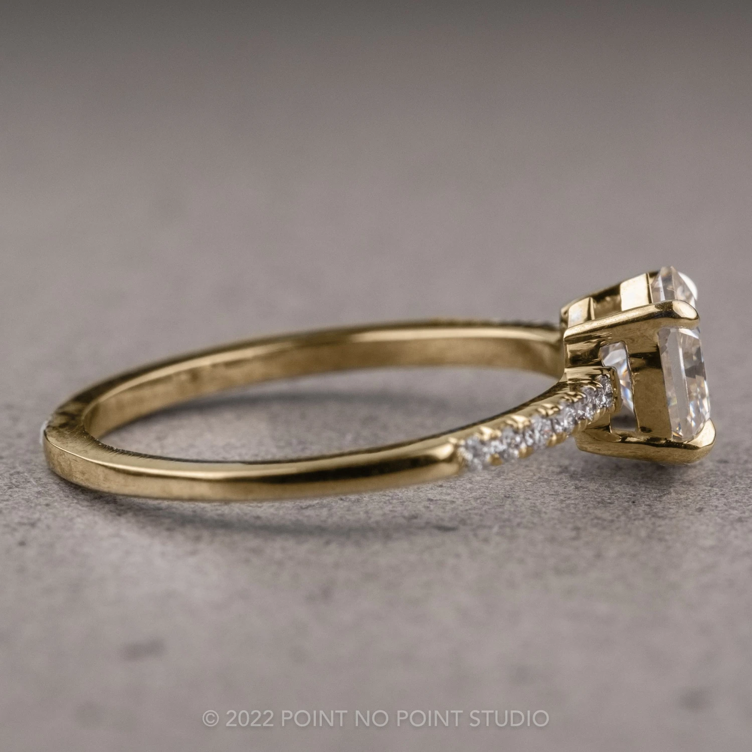 The moissanite is set in a low profile basket prong setting on a 1.7mm ring band. The entire ring is made of recycled yellow gold.