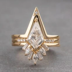 This timeless and unique engagement ring features a striking 1.50 carat step cut kite moissanite. The ring is finished with 3 sparkly GHSI round diamonds set into the band on either side to complete the look!