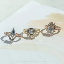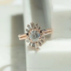 Shown pictured with our Salt and Pepper Baguette Wren wedding band, sold separately here.