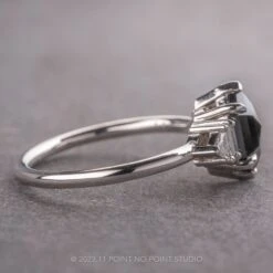 This unique and modern ring features a beautiful 1.41 carat black rose cut hexagon diamond. The hexagon is a top quality natural diamond; it is opaque with unique facets that catch the light. Set on either side of the diamond are beautiful GHSI white baguette diamonds accentuated by white triangle diamonds.Â
