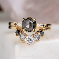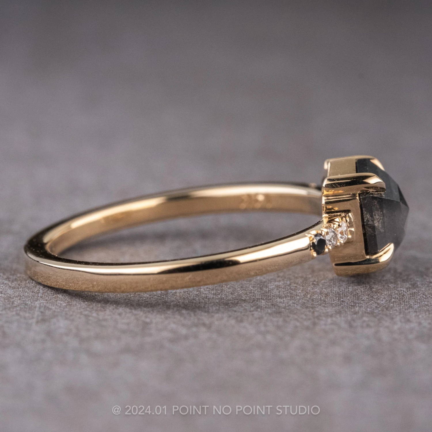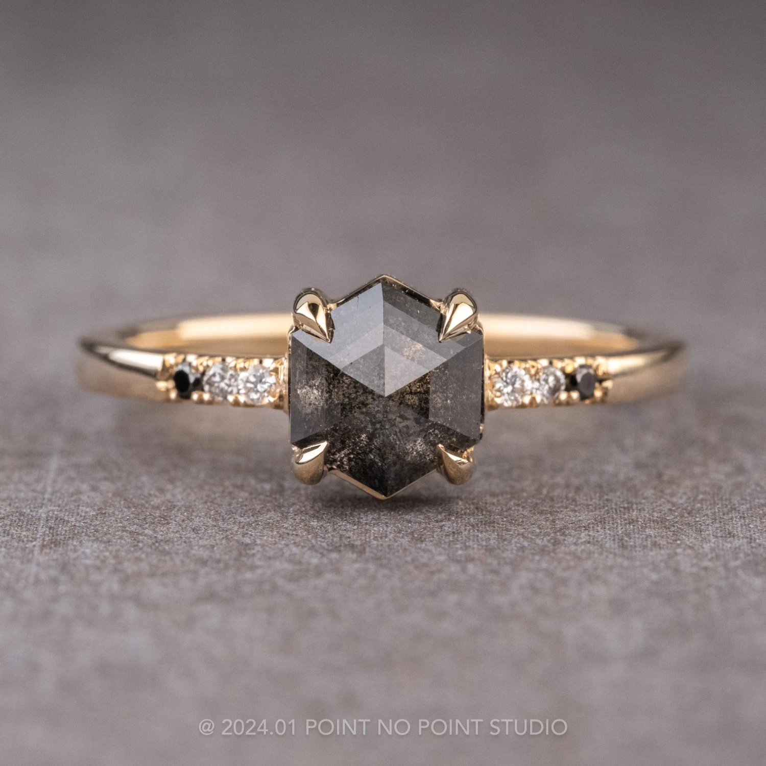 This captivating ring features a beautiful 1.51 carat black speckled hexagon rose cut diamond. The diamond is a top quality un-enhanced diamond; it is semi-translucent with unique tones and facets that catch the light. Set on either side of the center stone are 3 diamonds that are gradient in color. Each side of the hexagon diamond has one white, grey and black diamond set into the ring shank. Â