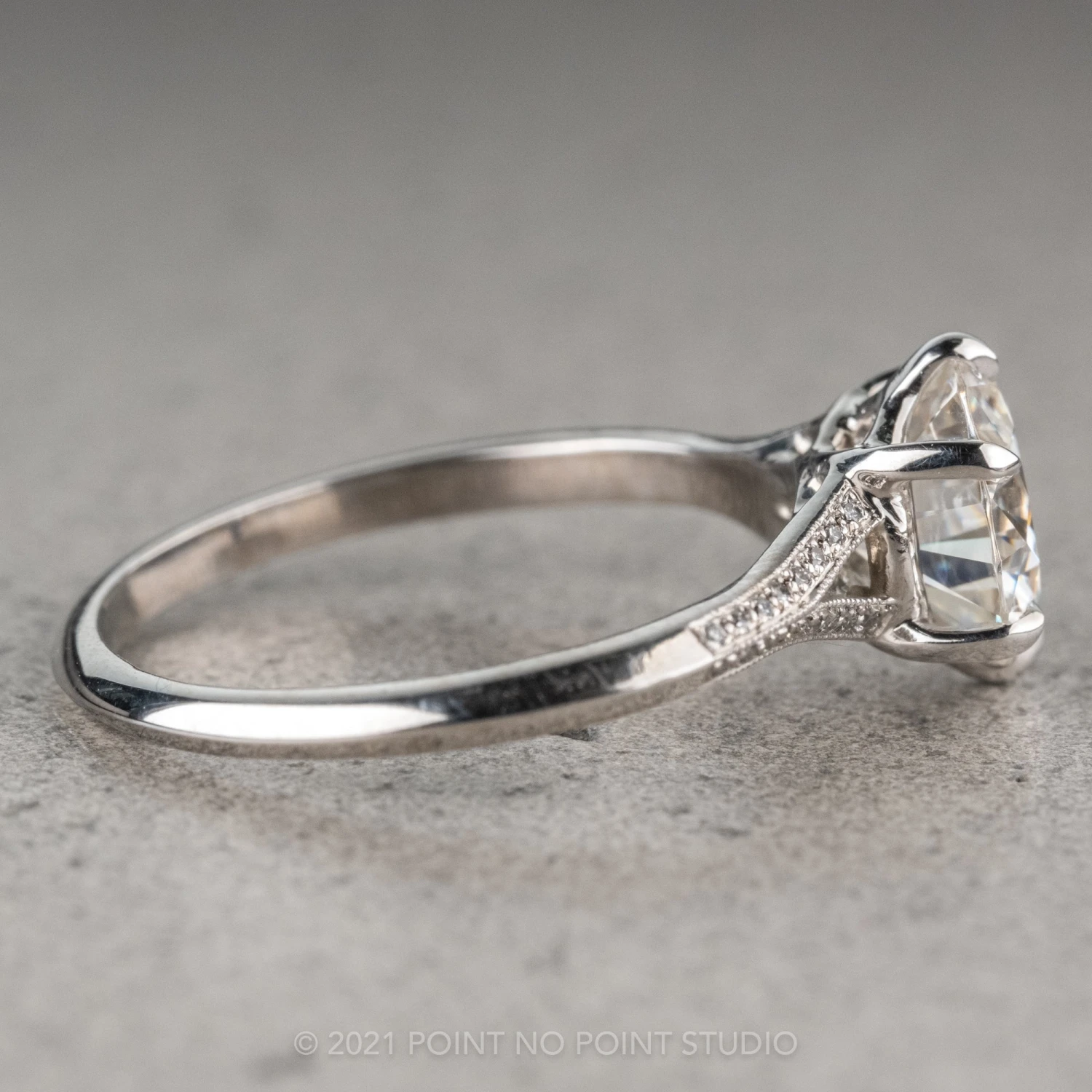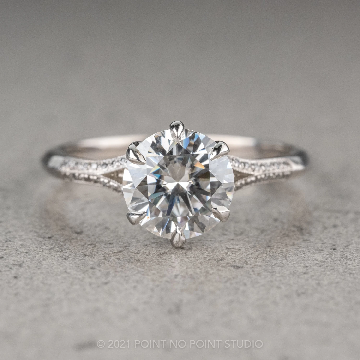 This ring features a stunning 1.5 carat moissanite with GHSI accent diamonds micro pave set around setting and band to give it that extra sparkle! Each of the seats for these accent diamonds is carved by hand which gives it a vintage feel and extra shine finish behind each of the tiny diamonds. The small diamonds in the band are accentuated by hand engraved milgrain.Â